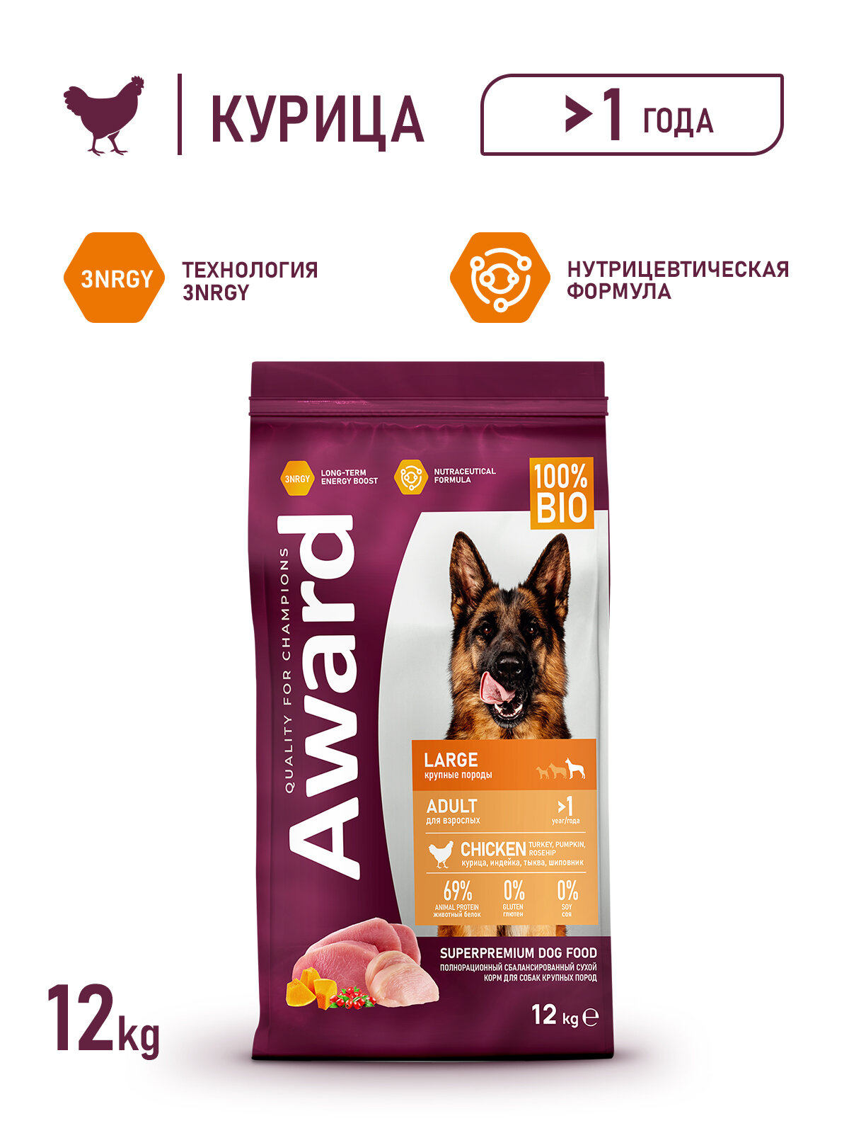 Сухой корм AWARD для взрослых собак крупных пород с курицей и индейкой с добавлением тыквы и шиповника 12 кг.