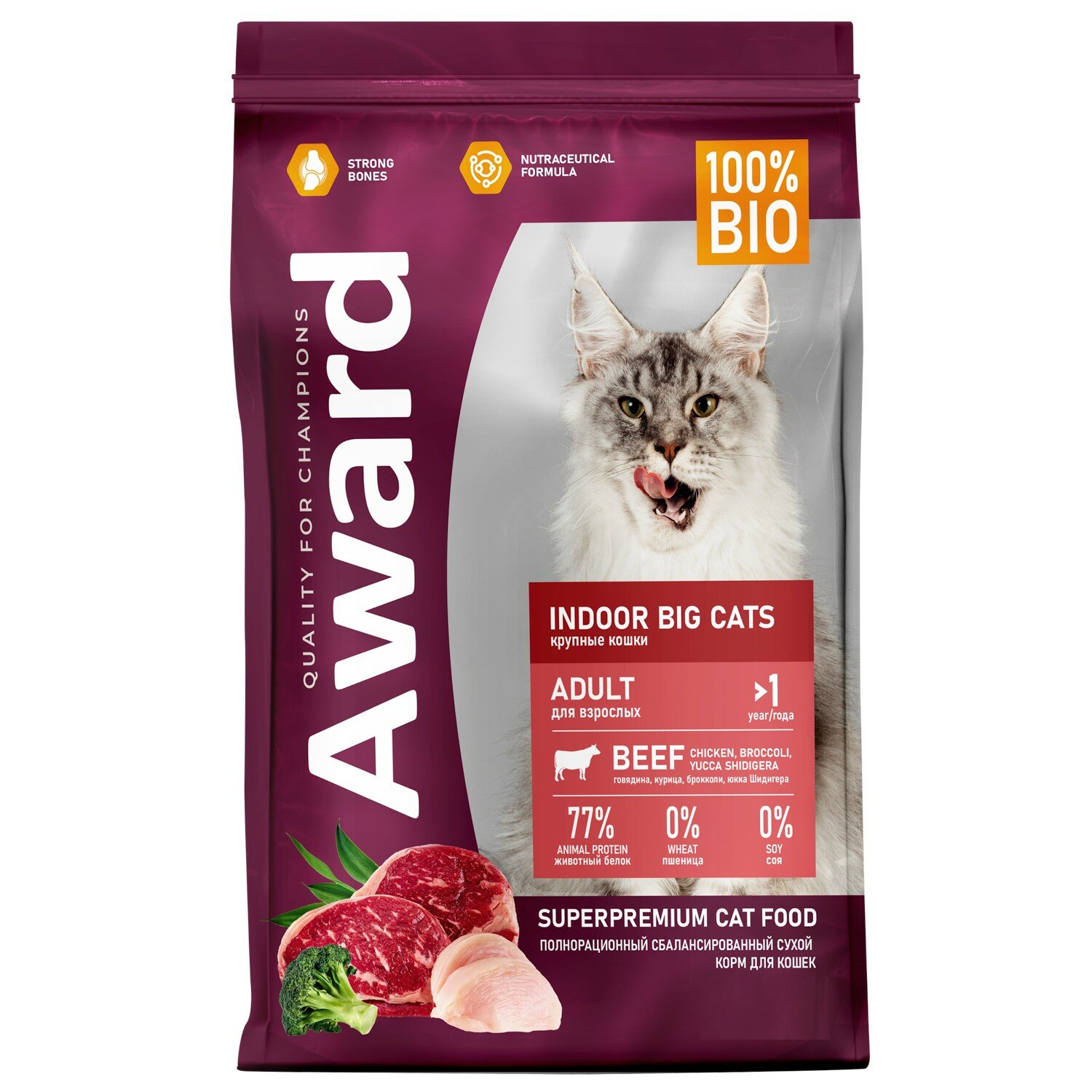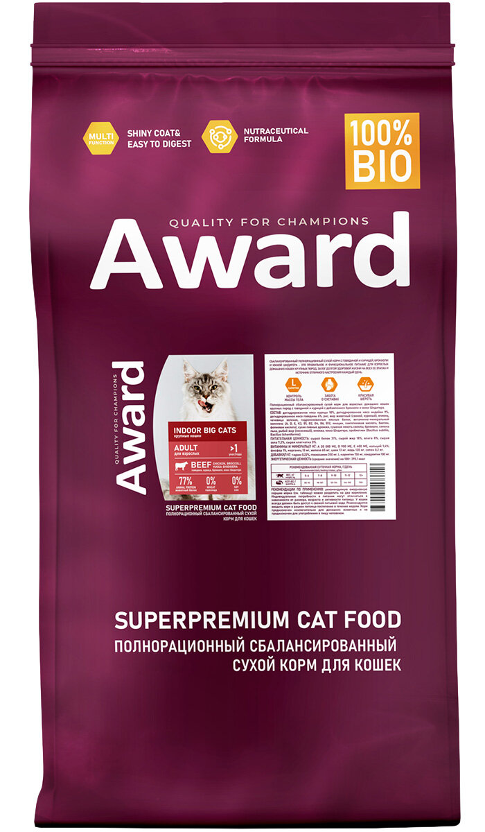 Сухой корм AWARD Indoor Big cats для взрослых домашних кошек крупных пород с говядиной и курицей с добавлением брокколи и юкки Шидигера 400 г Корм изготовлен из 100% натуральных ингредиентов по инновационной формуле — это обеспечивает комплексную нутрицевтическую поддержку организма питомца. Корм обогащен полиненасыщенными жирными кислотами, которые повышают качество шерсти и укрепляют иммунитет. Пробиотики и пребиотики помогают сохранять естественный баланс кишечной микрофлоры и способствуют оптимальному усвоению питательных веществ. Добавление L-карнитина позволяет контролировать массу тела, что особенно важно для кошек крупных пород. Без красителей и консервантов.