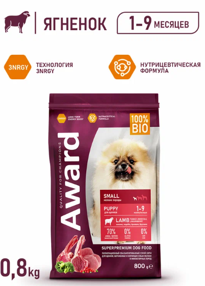 Сухой корм AWARD для щенков от 1 мес, беременных и кормящих сук мелких и мин. пород с ягненком и индейкой с добавлением брокколи и брусники 1,5кг. Корм изготовлен из 100% натуральных ингредиентов по инновационной формуле — это обеспечивает комплексную нутрицевтическую поддержку организма питомца. При изготовлении корма использовалась технология 3NRGY — сочетание полезных углеводов, дающее длительный запас энергии и чувство сытости. Корм обогащен полиненасыщенными жирными кислотами, которые повышают качество шерсти и укрепляют иммунитет. Пробиотики и пребиотики помогают сохранять естественный баланс кишечной микрофлоры и способствуют оптимальному усвоению питательных веществ. В состав добавлена брокколи — отличный источник клетчатки, улучшающий работу ЖКТ. Без красителей и консервантов.