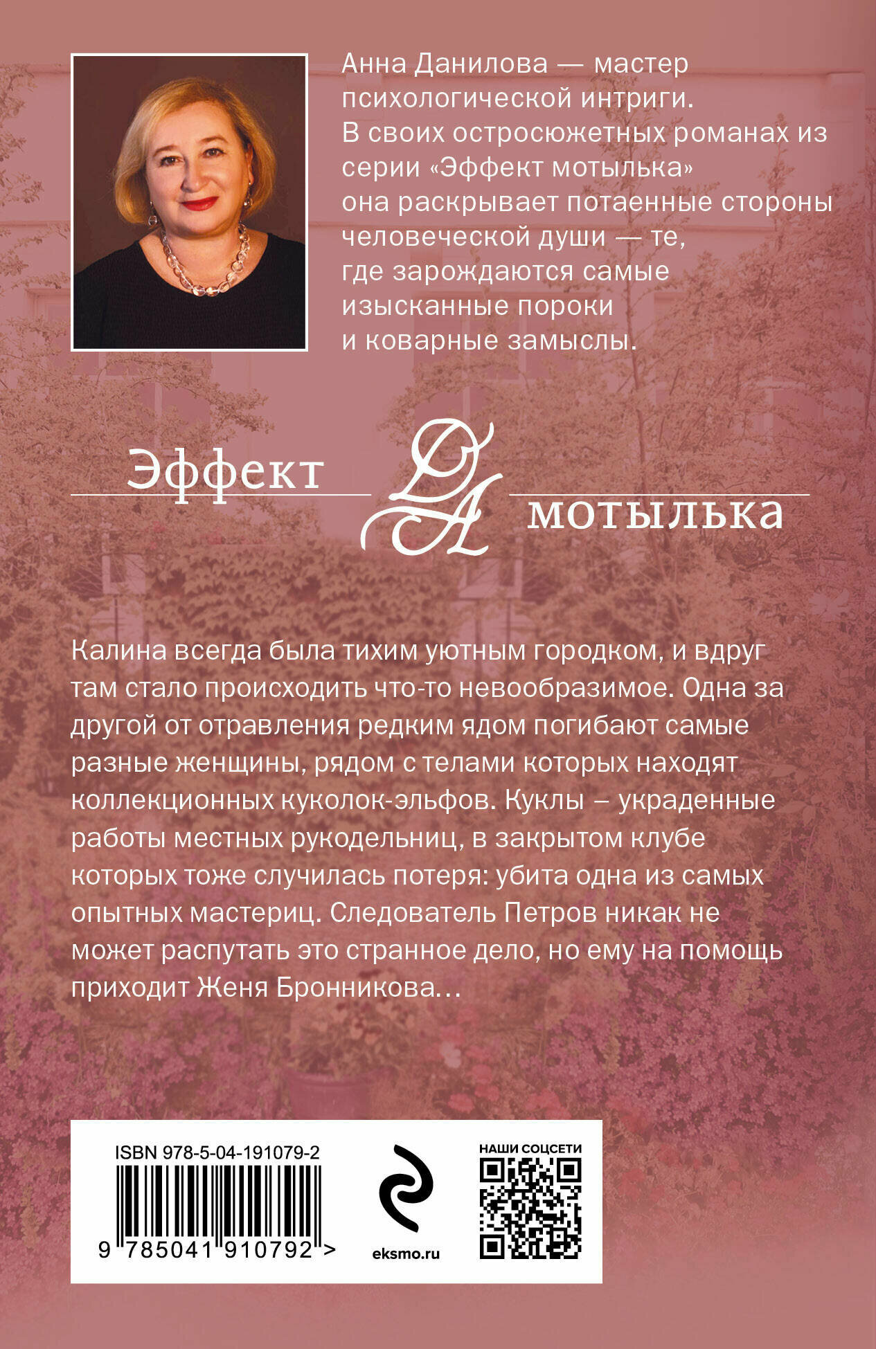 Калина всегда была тихим уютным городком, и вдруг там стало происходить что-то невообразимое. Одна за другой от отравления редким ядом погибают самые разные женщины, рядом с телами которых находят коллекционных куколок-эльфов. Куклы — украденные работы местных рукодельниц, в закрытом клубе которых тоже случилась потеря: убита одна из самых опытных мастериц. Следователь Петров никак не может распутать это странное дело, но ему на помощь приходит Женя Бронникова…