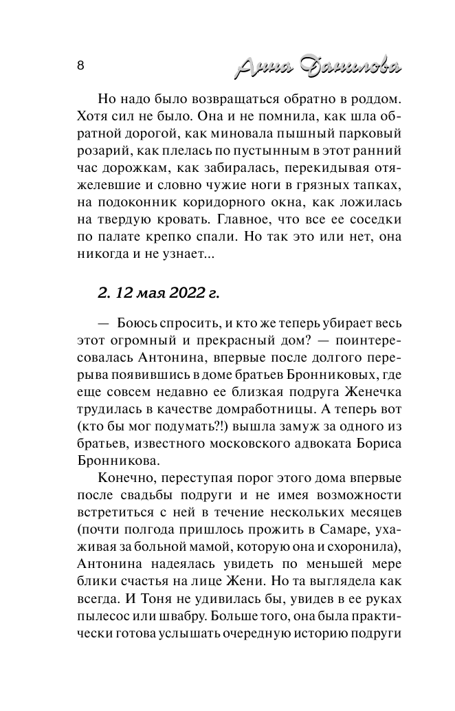 С 1998 года детективы Анны Даниловой выходят в издательстве «Эксмо» в таких сериях, как «Детектив глазами женщины», «Детектив по Фрейду», «Русский бестселлер», «Crime & private», «Эффект мотылька» и др. Всего издано более 120 книг автора.