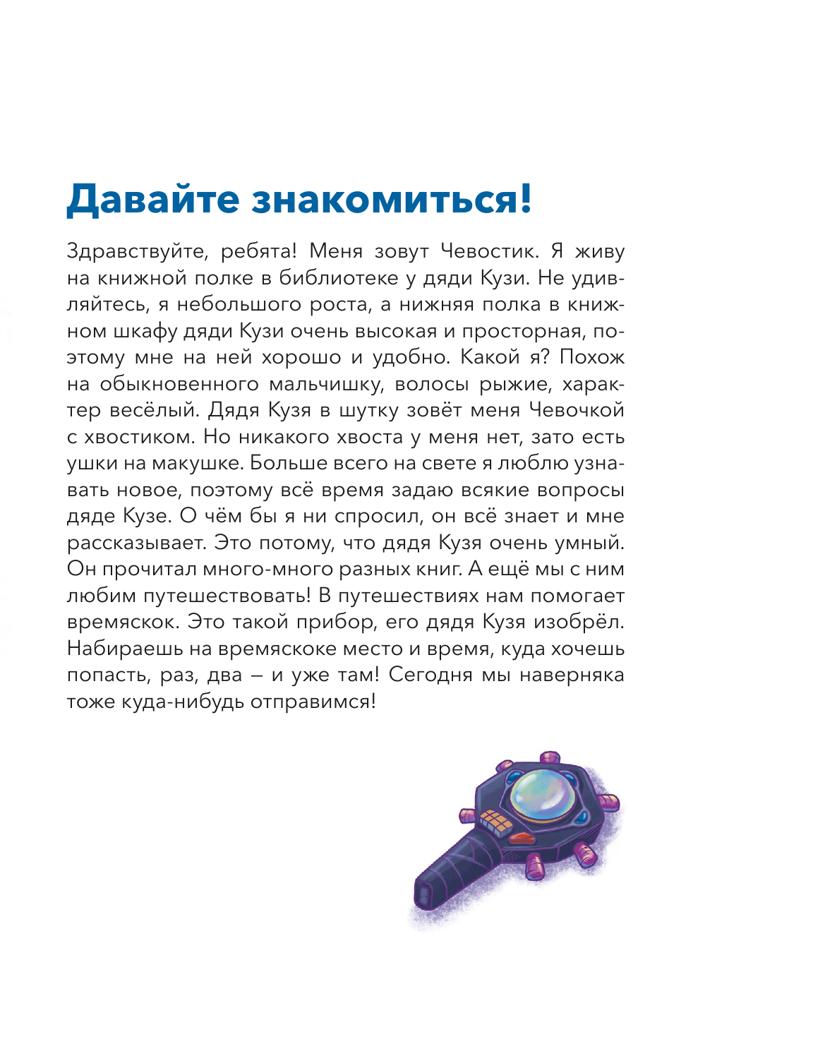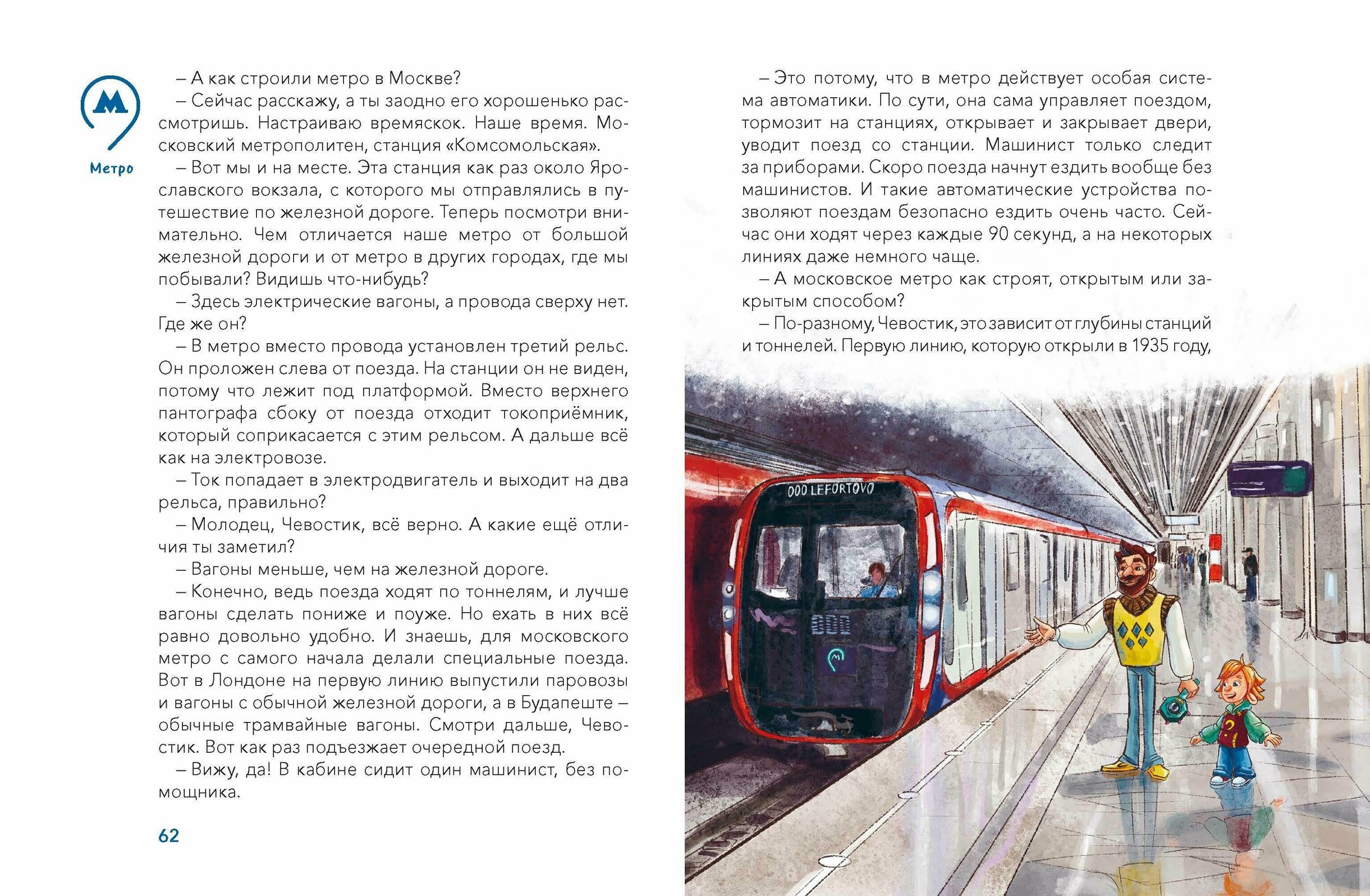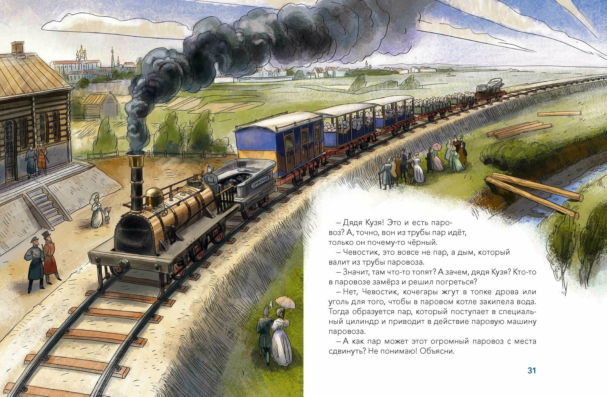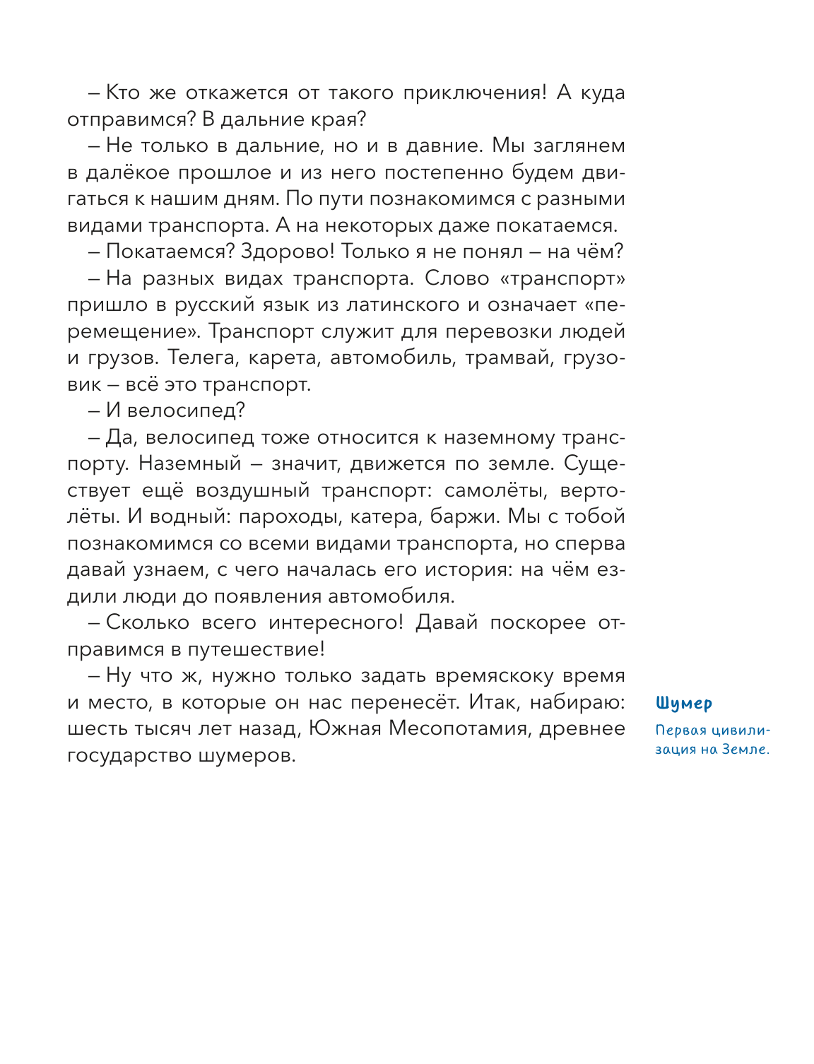 Чевостик и дядя Кузя начинают новое приключение. На этот раз им предстоит узнать всё про разные виды транспорта: автомобили, поезда, корабли, самолёты и даже космические аппараты. Вместе с любимыми героями читатели проследят путь от телеги до современного автомобиля, увидят открытие первой в России железной дороги, побывают на известных кораблях и познакомятся с великими авиаконструкторами. А затем отправятся на МКС и узнают, как человек научился путешествовать не только по Земле, но и в космосе.