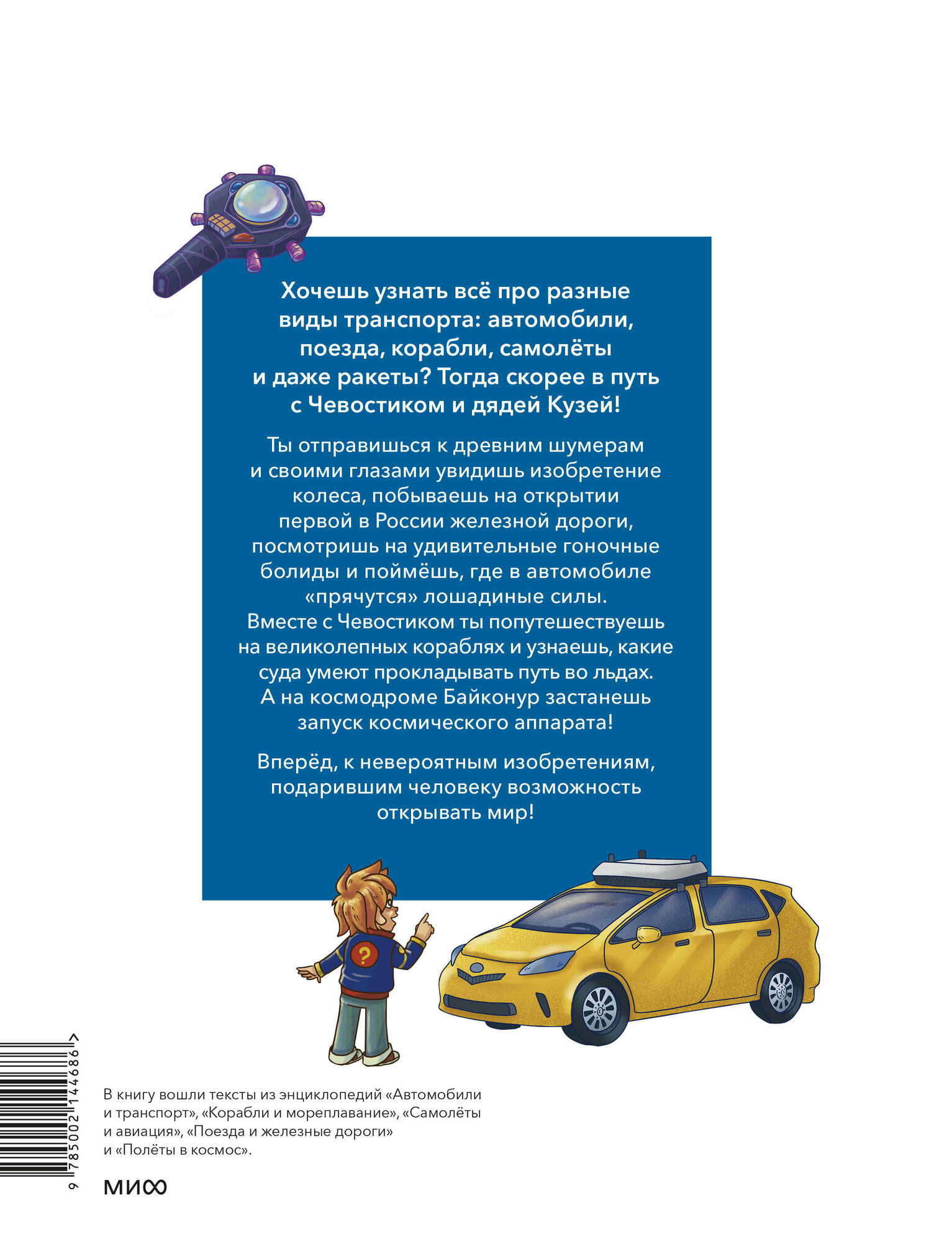 Автомобили, поезда, корабли, самолеты и даже космические аппараты Продолжение серии больших энциклопедий с Чевостиком Расскажет, где в автомобиле «прячутся» лошадиные силы и как изобрели колесо