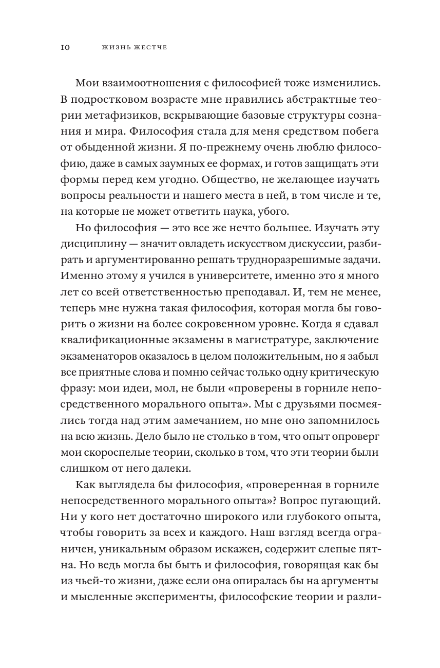 Если вам нелегко – вы в этом не одиноки. В книге «Жизнь жестче» американский философ Киран Сетия на личных примерах рассказывает, как мы сталкиваемся с физической болью, горем из-за утраты близких, ощущением, что каждый день происходит худшее, и ничего не изменишь. Но отчаиваться не стоит. Призывая на помощь Аристотеля и Канта, Теодора Адорно и Симону Вейль, а также внушительный корпус мировой литературы, искусства и науки, Сетия размышляет, каким образом древние и современные ритуалы помогают справиться со скорбью, как спортивные менеджеры и князь Мышкин могут отучить оценивать себя в категориях успеха и почему смысл работать и творить есть всегда, даже если мы обречены на вымирание. Книга Сетии – хорошее подспорье для тех, кто ищет способы жить достойно в несовершенном мире.