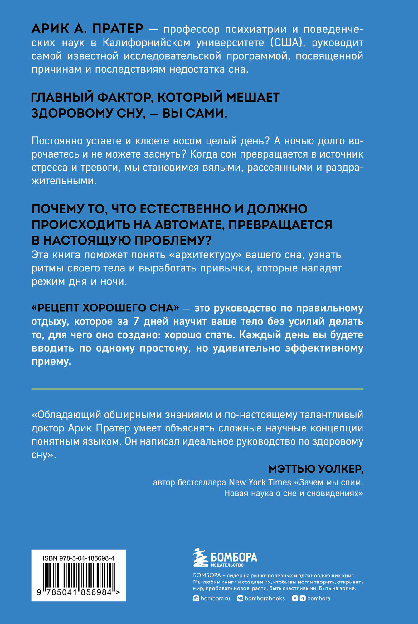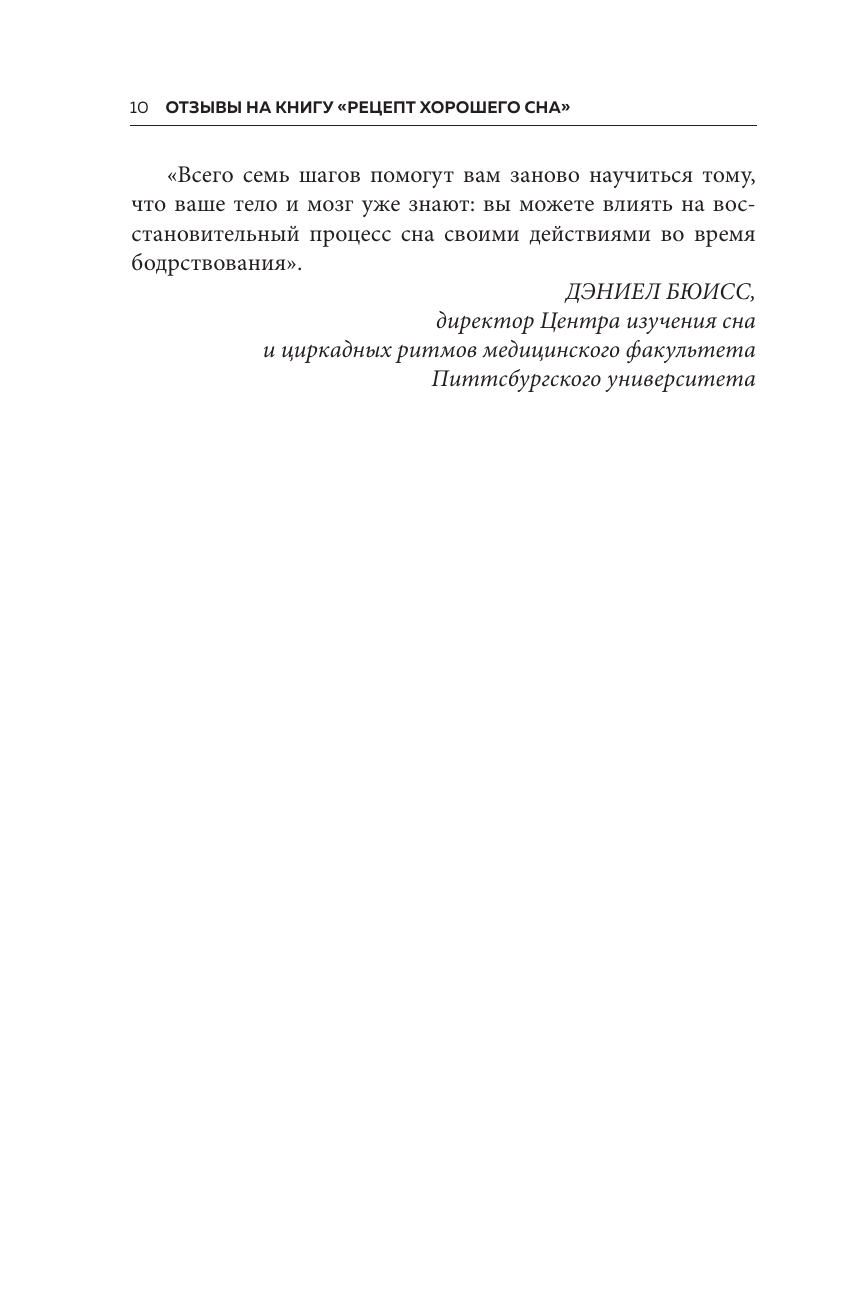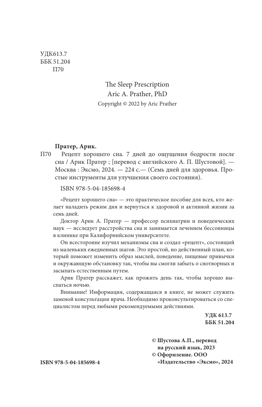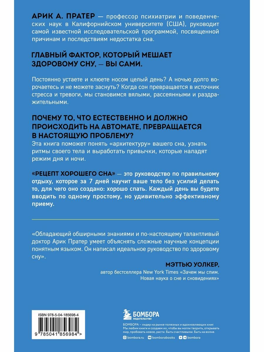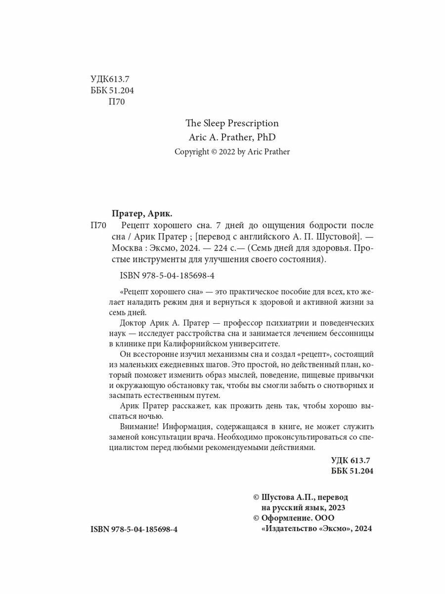 «Семь дней для здоровья. Простые инструменты» — новая серия полезных книг, которые изменят вашу жизнь за одну неделю. Это пошаговые рецепты для решения самых важных проблем. Они помогут вам наладить отношения с близкими, перестать беспокоиться и начать крепко спать по ночам. Постоянно устаете? Клюете носом целый день? А ночью долго ворочаетесь и не можете заснуть? Когда сон превращается в источник стресса и тревоги, мы становимся вялыми, рассеянными и раздражительными. Доктор Арик А. Пратер, профессор психиатрии и поведенческих наук, занимается лечением бессонницы и руководит исследовательской программой, посвященной причинам и последствиям расстройств сна. Пратер понял, главная проблема заключена в нас — мы сами нарушаем естественные ритмы организма и мешаем ему по-настоящему расслабиться и восполнять силы ночью. Эта книга поможет понять «архитектуру» вашего сна, узнать ритмы своего тела и выработать привычки, которые наладят режим дня. «Рецепт хорошего сна» — это руководство по правильному отдыху, которое изменит ваше поведение и поможет вернуться к здоровой и активной жизни за семь дней. Вы узнаете: · В каком ритме живет ваш организм? · Как избавиться от навязчивых мыслей, которые не дают уснуть? · Какие бывают стадии сна? · Как режим дня влияет на иммунитет? · Можно ли побороть зависимость от снотворного? · Какие БАДы способны нормализовать сон?