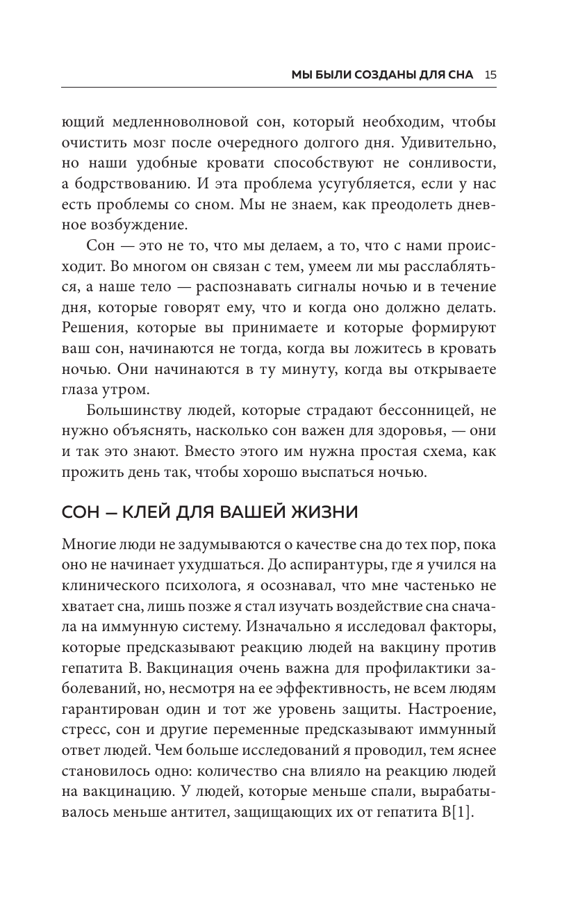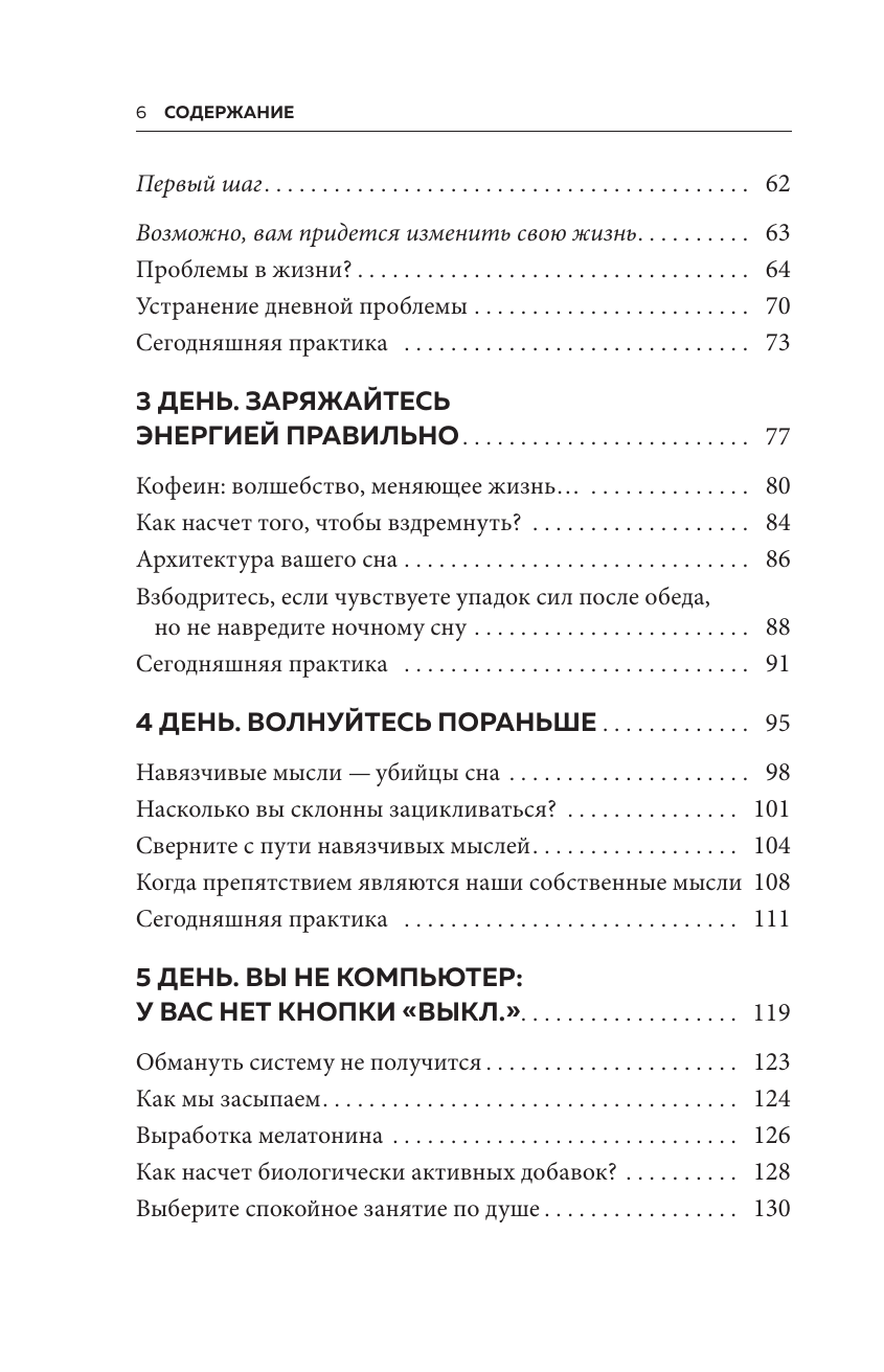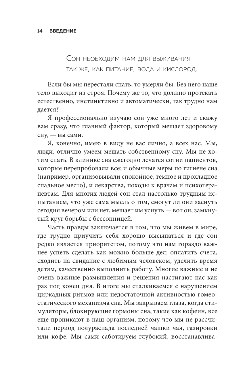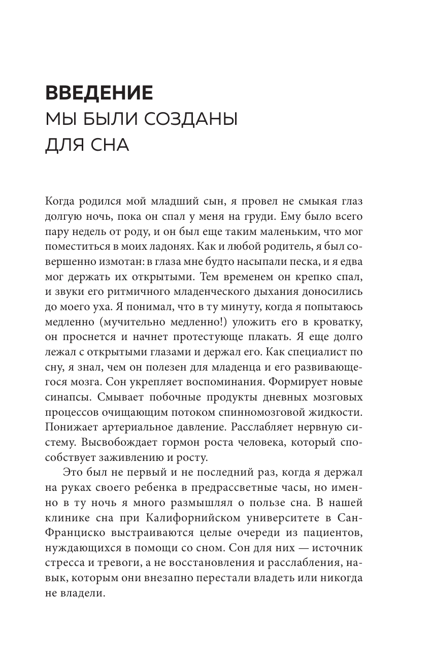 «Семь дней для здоровья. Простые инструменты» — новая серия полезных книг, которые изменят вашу жизнь за одну неделю. Это пошаговые рецепты для решения самых важных проблем. Они помогут вам наладить отношения с близкими, перестать беспокоиться и начать крепко спать по ночам. Постоянно устаете? Клюете носом целый день? А ночью долго ворочаетесь и не можете заснуть? Когда сон превращается в источник стресса и тревоги, мы становимся вялыми, рассеянными и раздражительными. Доктор Арик А. Пратер, профессор психиатрии и поведенческих наук, занимается лечением бессонницы и руководит исследовательской программой, посвященной причинам и последствиям расстройств сна. Пратер понял, главная проблема заключена в нас — мы сами нарушаем естественные ритмы организма и мешаем ему по-настоящему расслабиться и восполнять силы ночью. Эта книга поможет понять «архитектуру» вашего сна, узнать ритмы своего тела и выработать привычки, которые наладят режим дня. «Рецепт хорошего сна» — это руководство по правильному отдыху, которое изменит ваше поведение и поможет вернуться к здоровой и активной жизни за семь дней. Вы узнаете: · В каком ритме живет ваш организм? · Как избавиться от навязчивых мыслей, которые не дают уснуть? · Какие бывают стадии сна? · Как режим дня влияет на иммунитет? · Можно ли побороть зависимость от снотворного? · Какие БАДы способны нормализовать сон?