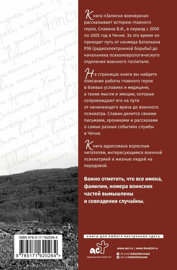 Книга "Записки военного врача" рассказывает историю главного героя, Славина В. И., в период с 2000 по 2005 год в Чечне. За это время он проходит путь от начмеда батальона РЭБ (радиоэлектронной борьбы) до начальника психоневрологического отделения военного госпиталя.Книга содержит описание опыта работы главного героя в боевых условиях и военной медицине, а также мысли и эмоции, которые сопровождают его по пути от начинающего врача до военного психиатра. Славин делится своими письмами, хрониками и рассказами о самых разных событиях службы в Чечне.Книга адресована взрослым читателям, интересующимся военной психиатрией и жизнью людей на передовой. Важно отметить, что все фамилии, номера воинских частей вымышлены, и совпадения случайны.