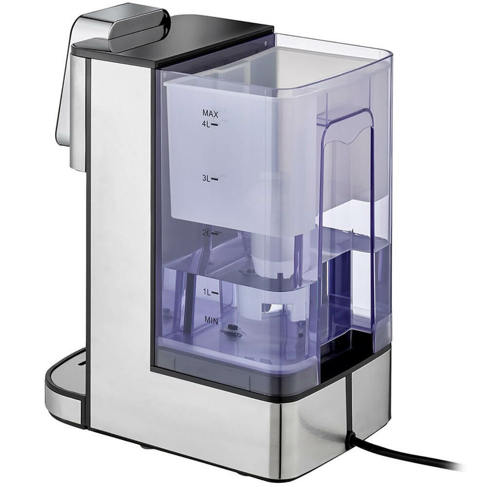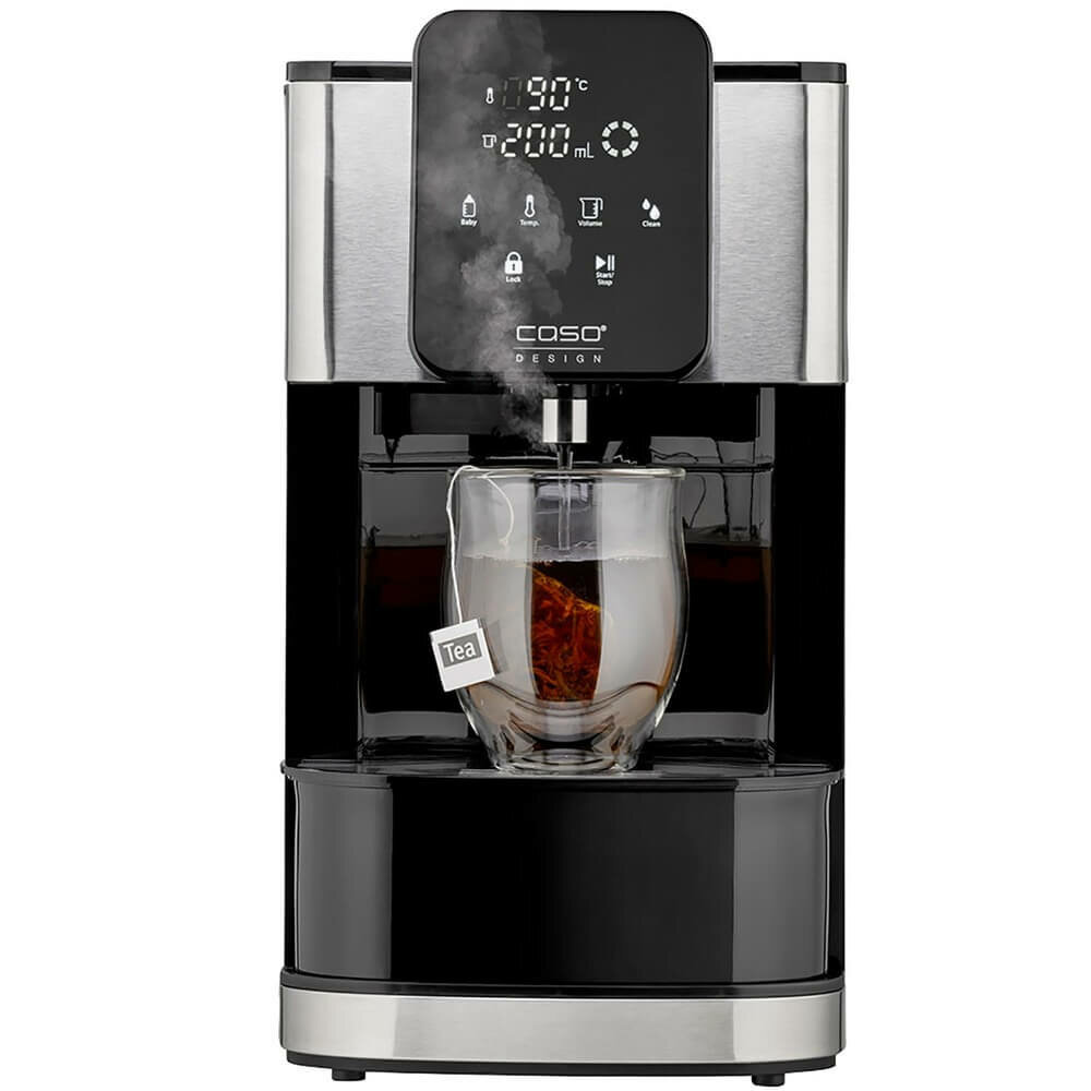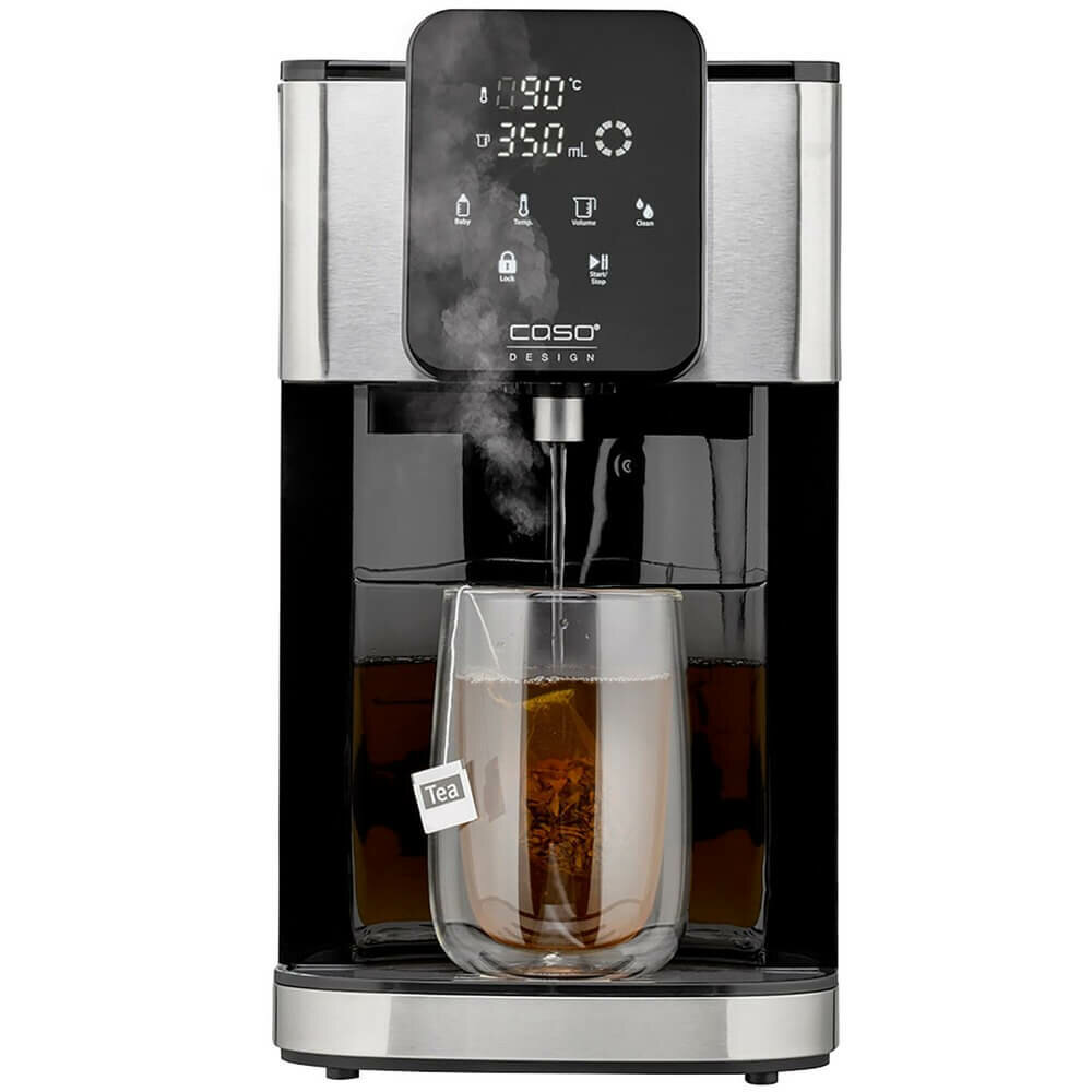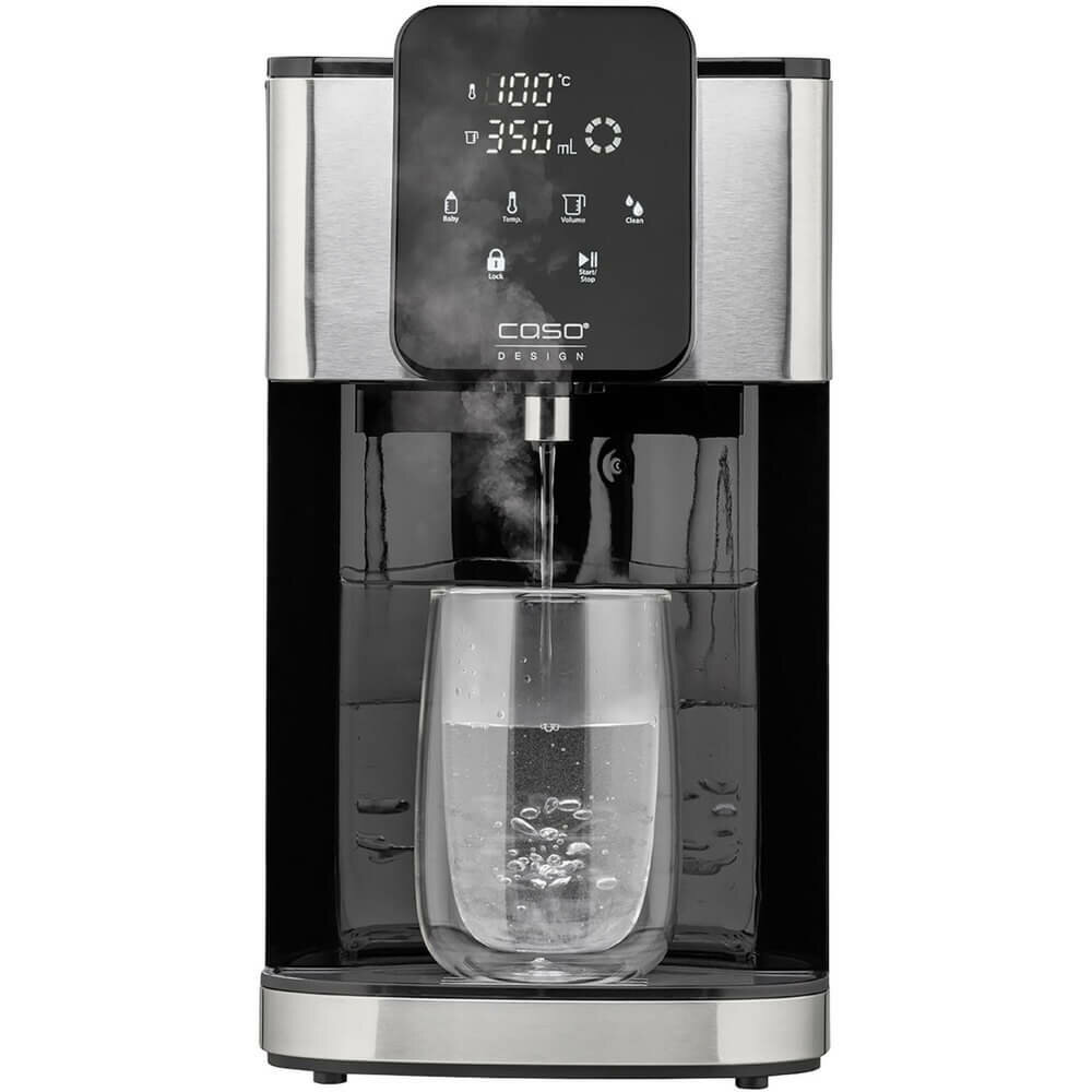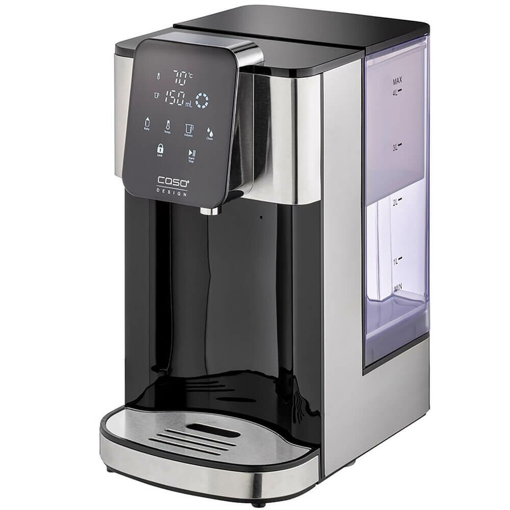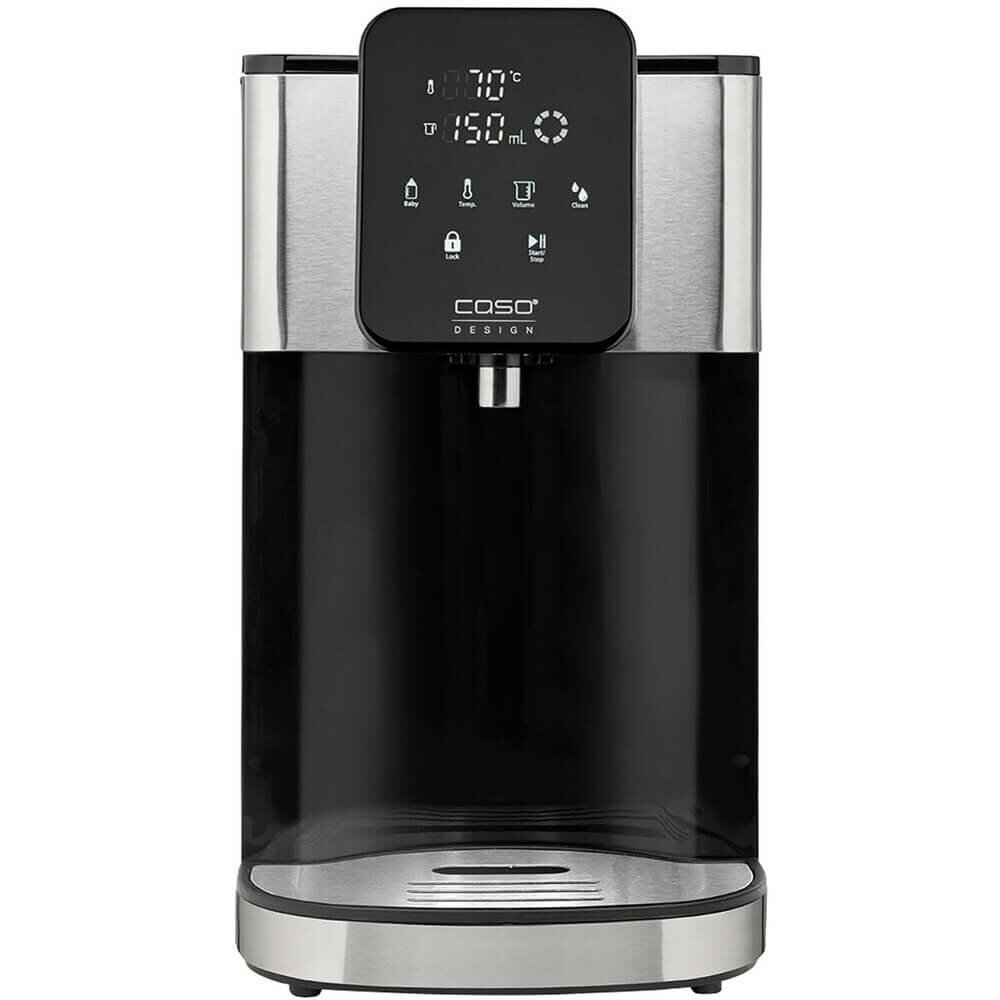 Диспенсер для горячей воды CASO греет воду только когда это необходимо и в выбранном объёме, что отличает его от чайника. Модель выделяется сенсорной панелью управления с интуитивно понятными иконками и большим цифровым дисплеем. Наливной насос запускается и отключается кнопкой включения. Температура регулируется в диапазоне от 40 до 100 °C с шагом в 10, чтобы подготовить воду для заваривания молотого кофе, чаев разных сортов или приготовления детского питания. Для последнего предусмотрена кнопка включения режима "Baby", при нажатии которой, вода будет подогреваться до 40°, и выдаётся пока вы не отпустите кнопку. Функциональные особенности: На отдельные кнопки вынесены следующие функции: Режим ("Baby") Блокировка Установка температуры Установка объема Старт/стоп Очистка Особенности работы 8 настроек объема: 100, 150, 200, 250, 300, 350, 400 и непрерывная подача. Для чашек высотой до 17 или 19,5 см (если убрать поддон для капель). Съемный резервуар для воды на 2.7 литра. Угольный фильтр, для защиты от накипи. Защита от перегрева и кнопка Reset. Сохранение электроэнергии. Поддон для сбора капель. 7 температурных режима: 0 (комнатная температура), от 40 °C до 100 °C.