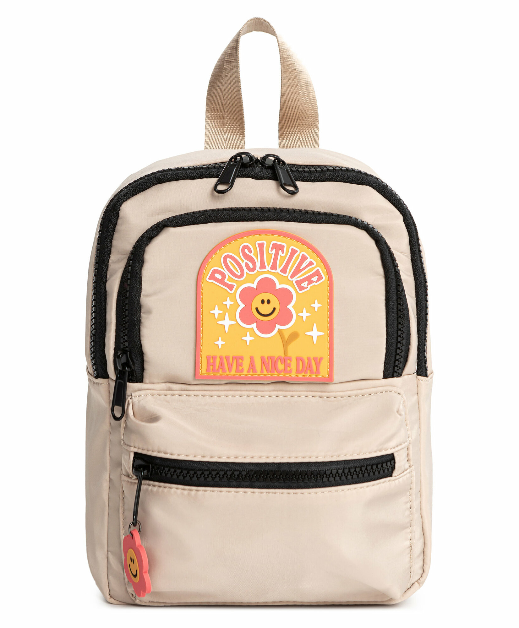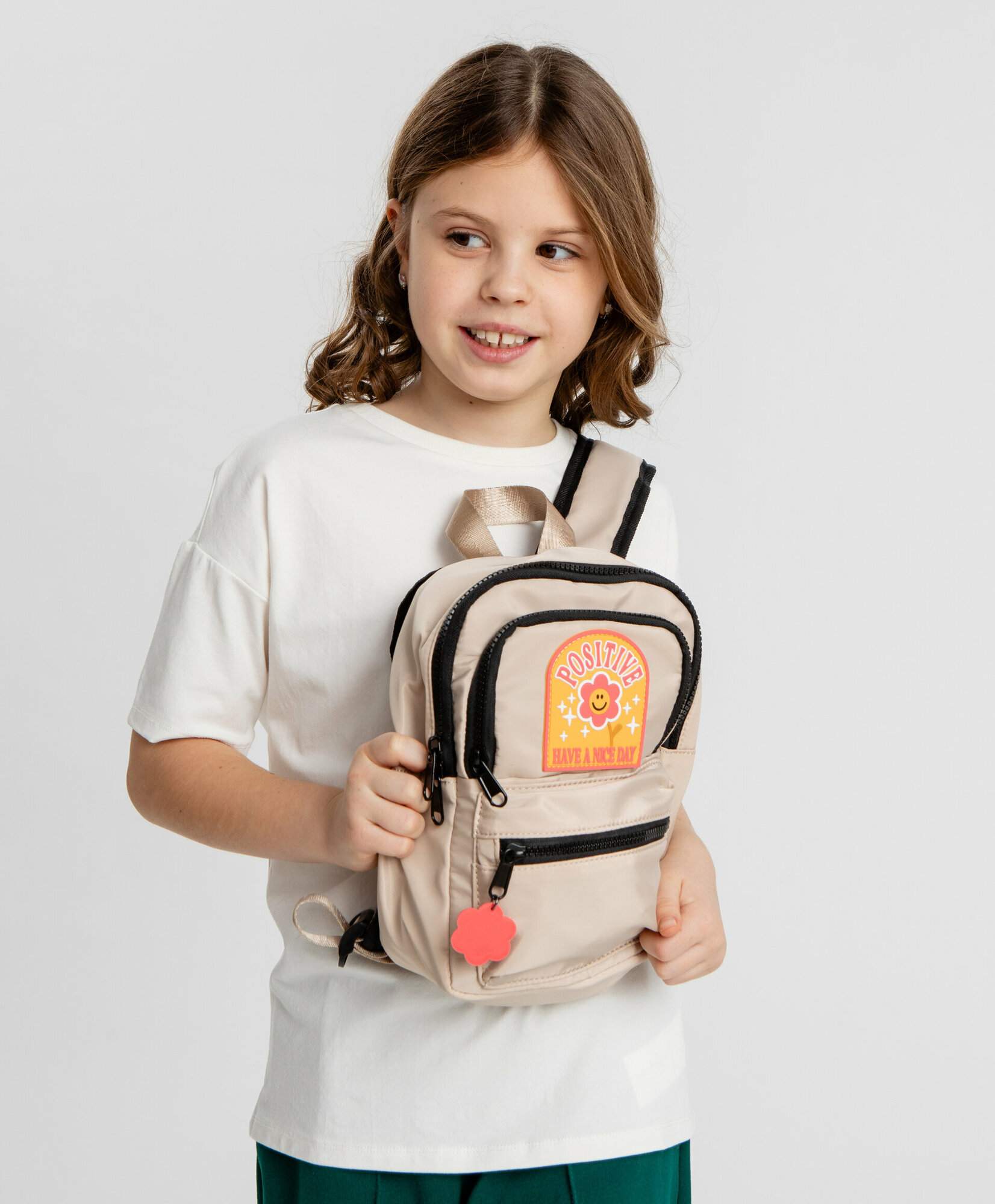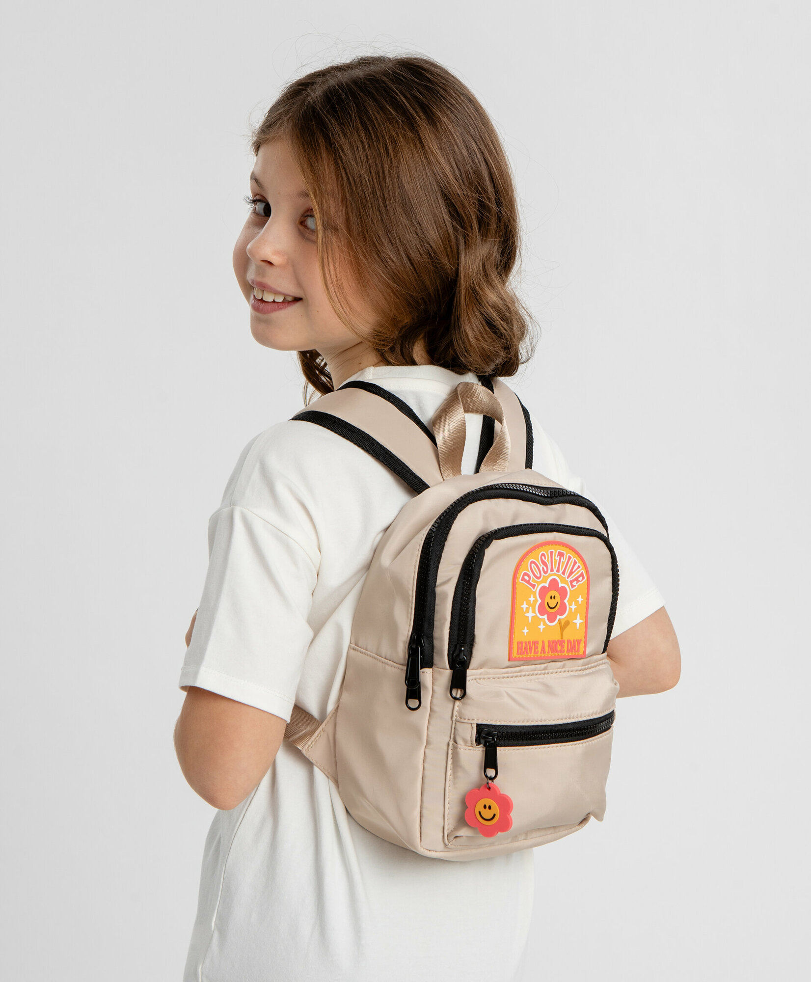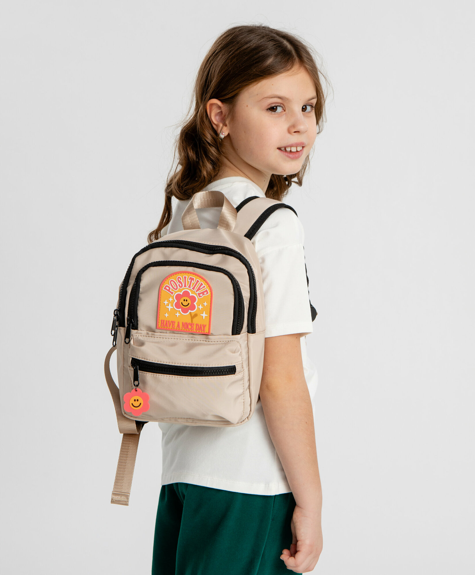 Бежевый рюкзак. Минималистичный и базовый дизайн в сочетании с гладкой поверхностью и нашивкой спереди создают неповторимый стильный образ. Рюкзак выполнен из 100% полиэстера, что обеспечивает долговечность. Подкладка также изготовлена из 100% полиэстера, что делает рюкзак мягким и комфортным в использовании. Бежевый цвет подходит к любому наряду и подчеркивает нежность и изящество маленькой модницы.