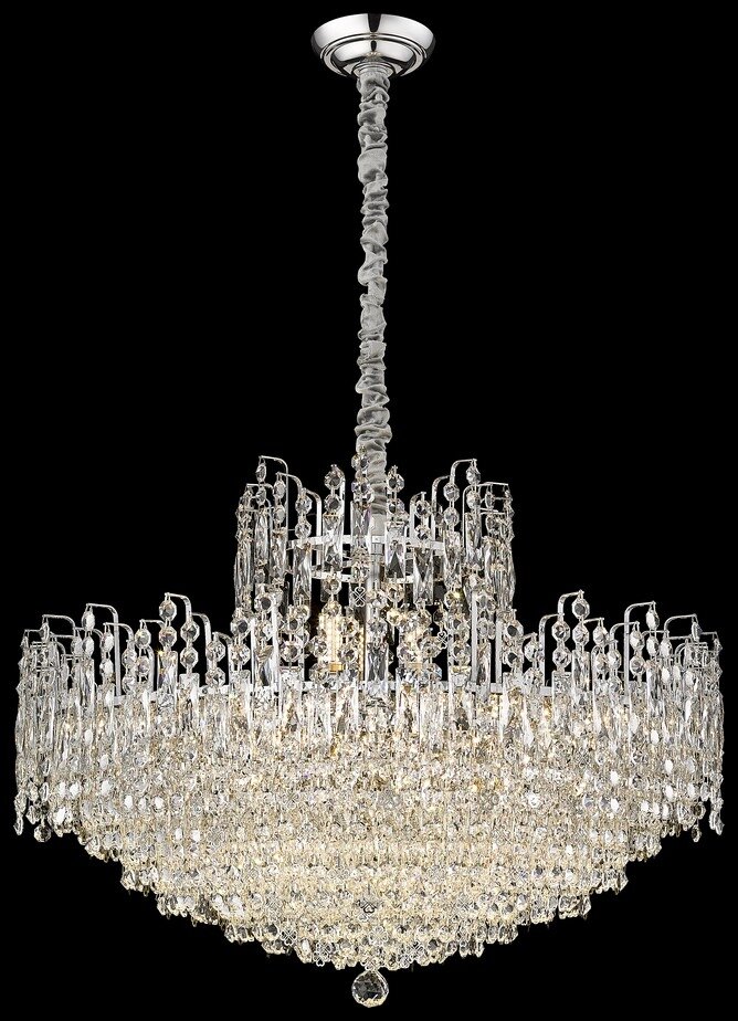 Эта потрясающая подвесная люстра Wertmark Marcella WE154.21.103 - это воплощение современного стиля и элегантности для вашего интерьера. Превосходное сочетание хрусталя и металла создает изысканный дизайн, который добавляет шик и изысканность любому помещению. Сочетание размеров - высота 600 мм и диаметр 800 мм - делает эту люстру прекрасным центральным элементом в любой комнате, будь то гостиная, спальня или кабинет.Светильник оснащен 21 цоколем E14, позволяющим использовать лампы накаливания или светодиодные лампы (LED) с максимальной мощностью до 40 Вт каждая. Общая мощность составляет 840 Вт, обеспечивая достаточно яркий свет в помещении. Бренд Wertmark из Австралии гарантирует высокое качество изделия, подчеркивая свою надежность гарантией на 12 месяцев. Хромированная арматура и хрустальные плафоны подчеркивают роскошный вид люстры, а ее универсальное место установки на потолке и возможность подключения диммера делают ее удобным и функциональным решением для вашего дома.Эта люстра Wertmark Marcella WE154.21.103 станет не просто источником света, но и изысканным декоративным элементом, который преобразит ваш интерьер, придавая ему элегантность и изысканность.