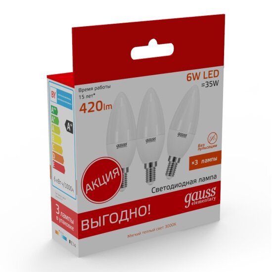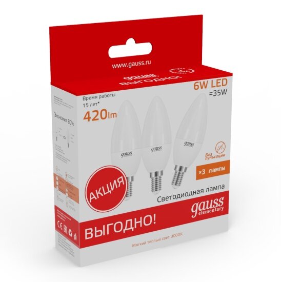 Комплект из трех штук светодиодных ламп Gauss в форме "свечи", под цоколь Е14, с потребляемой мощностью в 6 Вт, что является аналогом лампе накаливания в 60 Вт. Температура свечения 2700К - мягкий теплый свет. Световой поток 420 Лм. Данная серия ламп в экономичной упаковке (3шт.) создана для массового потребителя и имеет самое лучшее соотношение цена-качество. Отличное решение для люстр и бра.