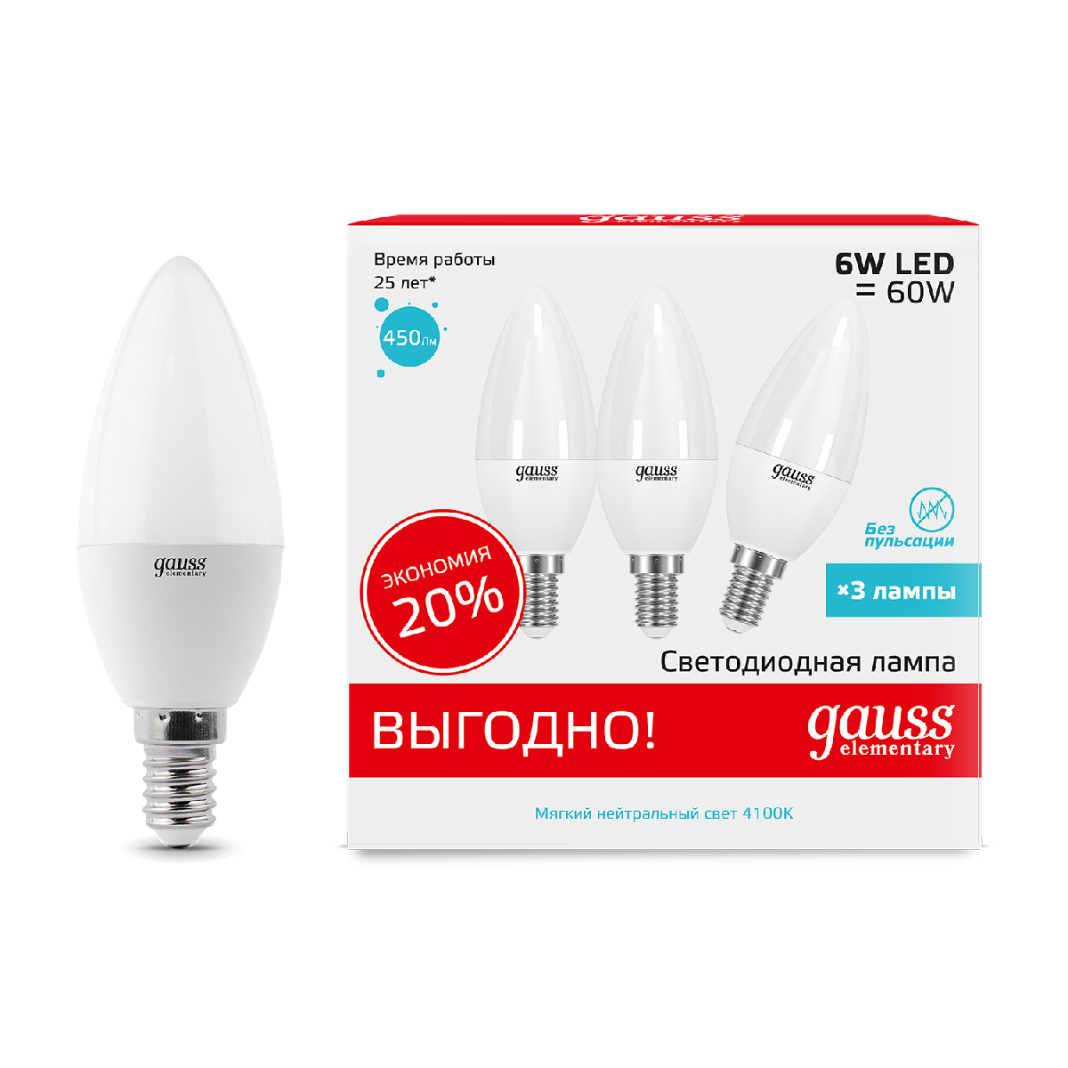 Gauss Elementary Лампа светодиодная Е14 180-240В 6Вт 4100К упак 3шт Светодиодная лампа - это современная альтернатива традиционной лампы накаливания. От обычной энергосберегающей лампы лампу этого типа отличает отсутствие ртути, что повышает ее экологическую безопасность и облегчает процедуру утилизации. Выгорание обивки мебели, краски и прочего не происходит за счет того, что светодиодная лампа не дает УФ-излучения, а высокая устойчивость к ударам позволяет использовать ее даже для уличного освещения.