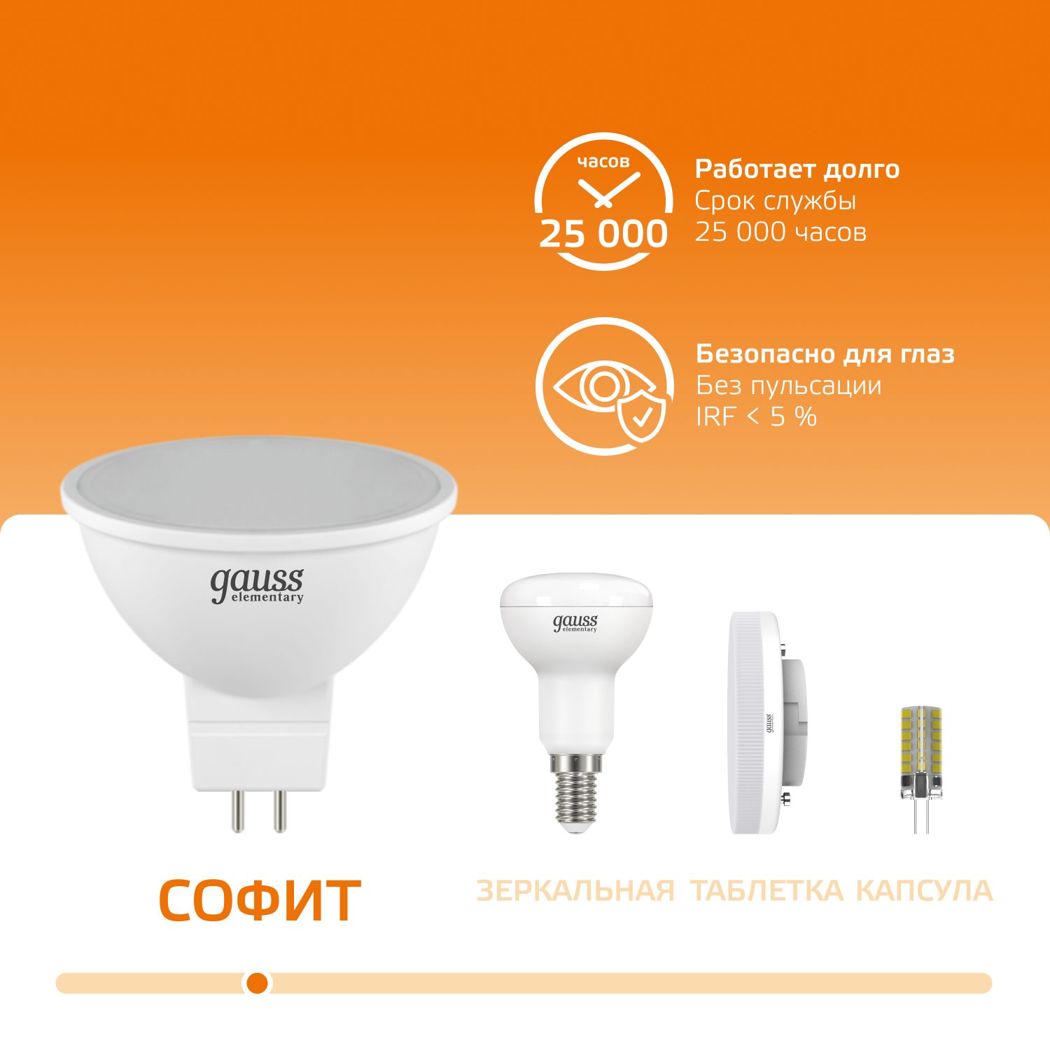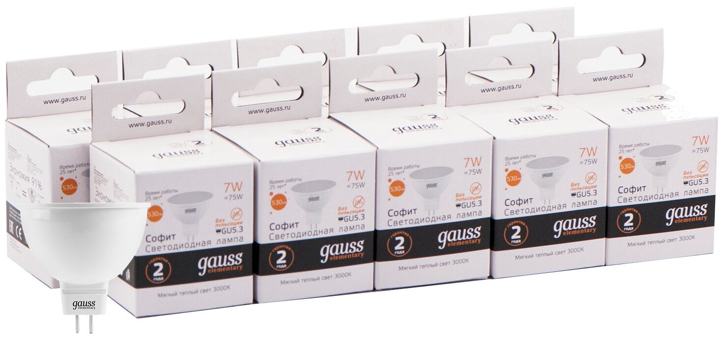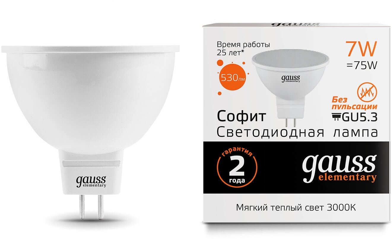 Было куплено 6 таких ламп (по три в зале и детской). За 1,5 года полностью вышла из строя 1 лампа. По гарантии не поменяли, т.к. гарантия на них 1 год. Было в тот же день куплено 6 Camelion-ов и 5 Feron-ов. Из Camelion-ов за 1,5 года вышло из стоя 4 шт., но там гарантия 2 года. Из Feron-ов за 1,5 года вышло из стоя 1 шт.( на коробке написано гарантия 2 года, но частник дает только 1 год). В итоге Gauss чуток более надежен, но гарантия тех же Camelion-ов перекрывает их недостатки.