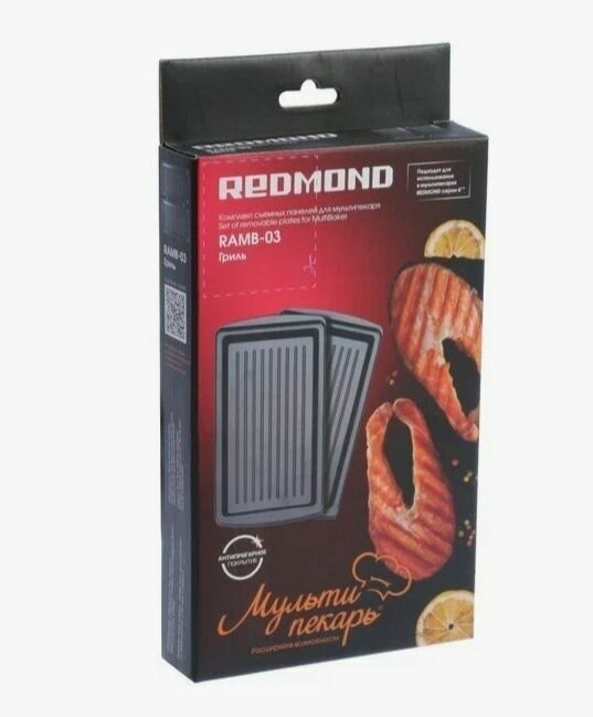 Панель для мультипекаря Redmond позволяет обжаривать мясо, рыбу, грибы и овощи. Особая структура металла и большая толщина позволяет получать такой же эффект, как при готовке на гриле или при запекании на углях. Антипригарное покрытие позволяет готовить с минимальным количеством масла, а специальные ребра в основании способствуют стеканию жира, не допуская его впитывания в продукты.