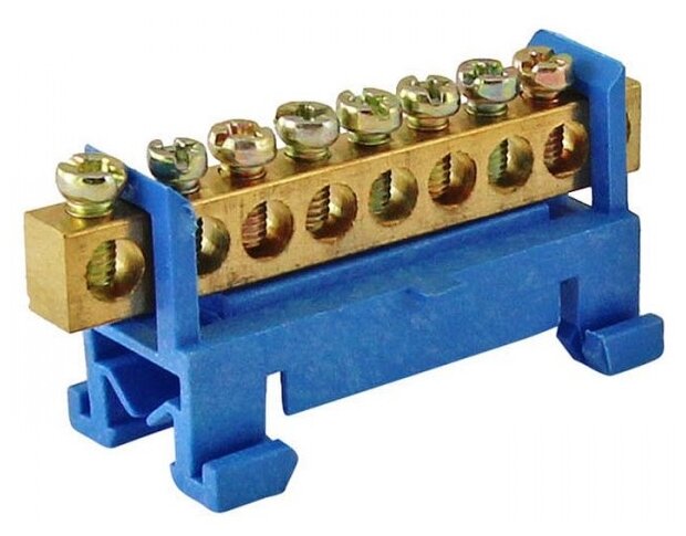 Не большая нулевая шина на рейку. Шина стоит на пластиковом изоляторе синего цвета. Имеет 8 одинаковых отверстий с винтами. Металл зажима нормального качества. Провода зажимаются надежно. На рейку входит с усилием. Шина идет в запаянной полиэтиленовой пленке. Этим и отличается от такой же шины, которая немного подешевле. Больше отличий нет