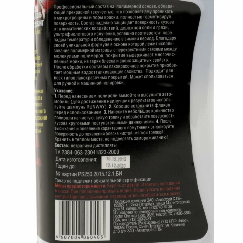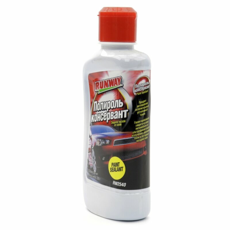 Автохимия Runway Профессиональный состав на полимерной основе, обладающий прекрасной текучестью, что позволяет ему проникать в микротрещины и поры краски, полностью герметизируя поверхность. Состав надежно защищает поверхность кузова от климатических воздействий, дорожной соли и грязи, ультрафиолетового излучения, успешно противостоит перепадам температур и обледенению в зимний период. Благодаря своей уникальной формуле в основе, которой лежит использование полимерной матрицы с перекрестными связями между молекулами полимеров, покрытие выдерживает многочисленные мойки, не теряя блеска и своих защитных свойств. После обработки составом лакокрасочное покрытие приобретает мощные водоотталкивающие свойства. Подходит для всех типов лакокрасочных покрытий. Может использоваться для ручной и машинной полировки.