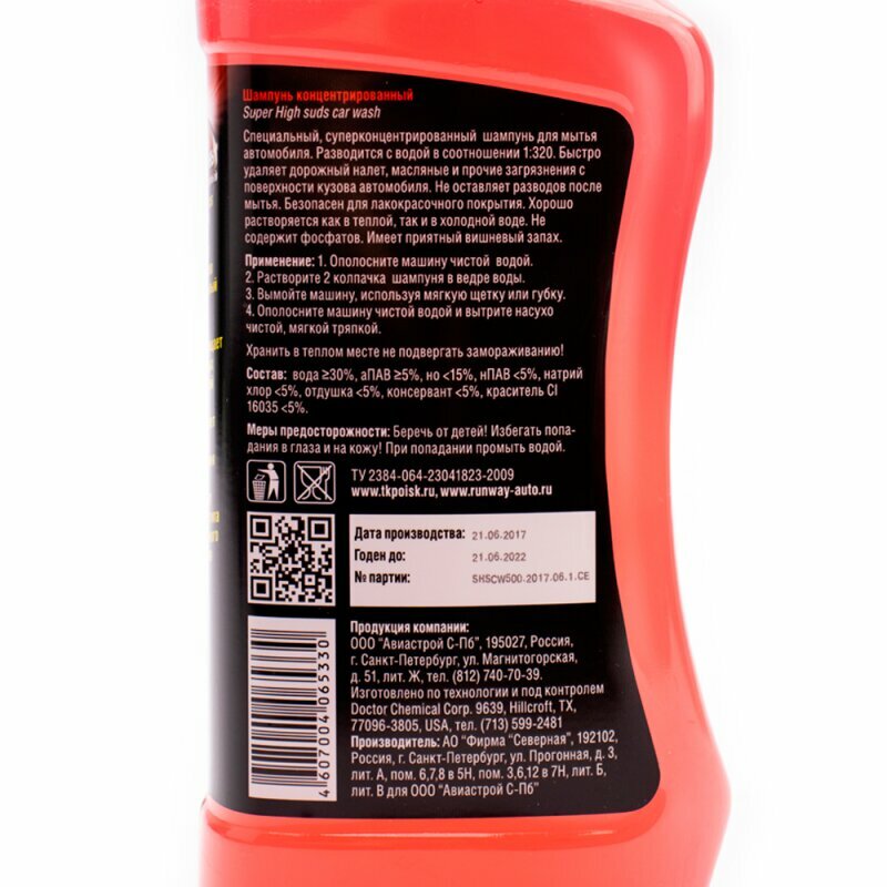 Автомобильный шампунь хорошо пенится, что обеспечивает эффективную и безопасную очистку кузова автомобиля от загрязнений. Не оставляет разводов после мытья. Хорошо растворяется как в тёплой, так и в холодной воде. Шампунь концентрированный, хватает на долго. Обладает приятным запахом вишни.