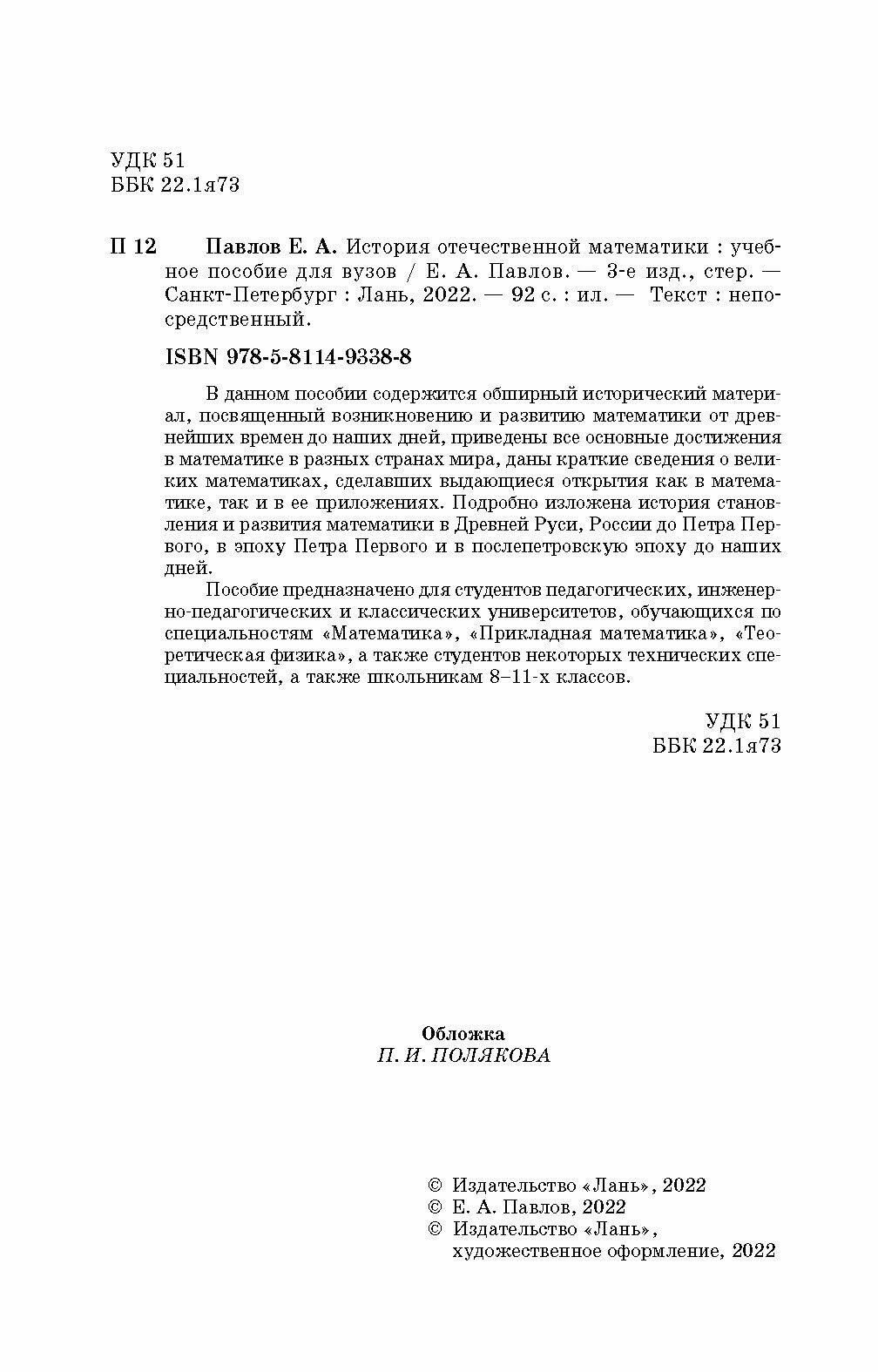 История отечественной математики (Е. А. Павлов); Издательство ЛАНЬ, 2022