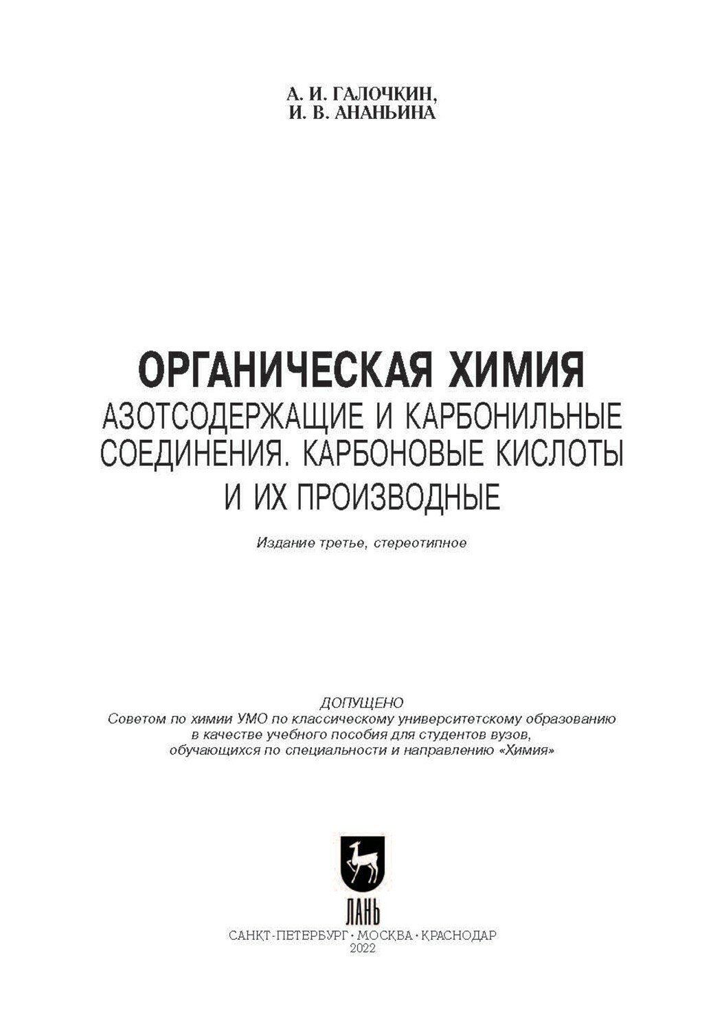 Органическая химия. Книга 3. Азотсодержащие и карбонильные соединения. Карбоновые кислоты и их производные (А. И. Галочкин); Издательство ЛАНЬ, 2022