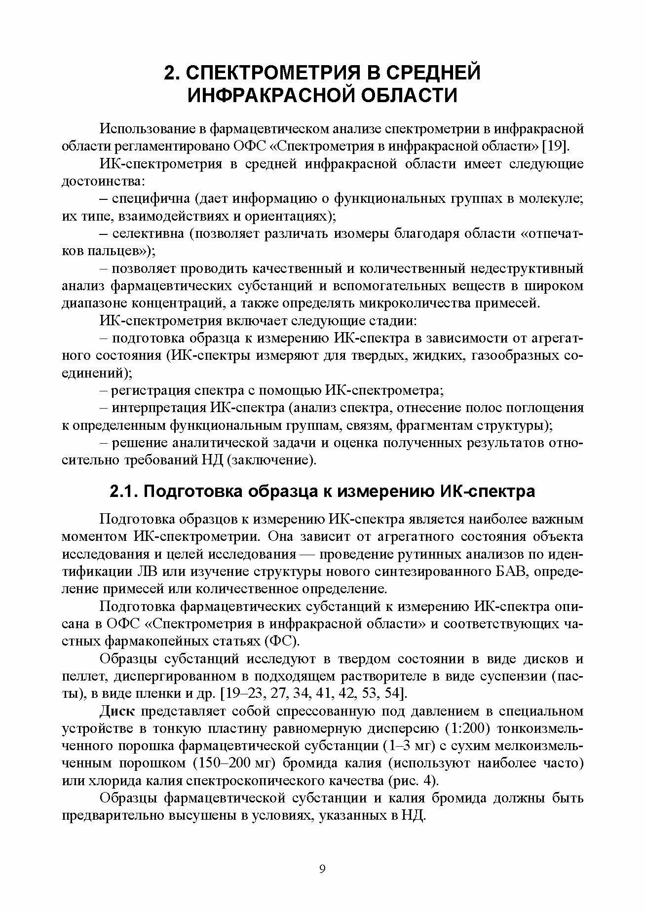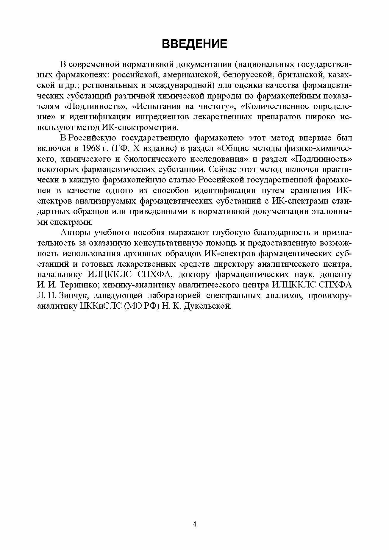 Учебное пособие составлено в соответствии с программой для студентов, обучающихся по специальности 33.05.01. «Фармация». Оно может быть полезным для провизоров, проходящих повышение квалификации или переподготовку по специальности «Фармацевтическая химия и фармакогнозия», магистров, адъюнктов, аспирантов, молодых специалистов, занимающихся контролем качества лекарственных средств, лиц, интересующихся проблемой использования метода ИК-спектрометрии в фармацевтическом анализе, а также в курсе «Выявление фальсифицированных лекарственных средств». Учебное пособие содержит примеры и иллюстрации, отражающие использование ИК-спектрометрии в фармацевтическом анализе для оценки качества фармацевтических субстанций по показателям «Подлинность», «Чистота», «Количественное определение», идентификации ингредиентов готовых лекарственных форм (ГЛФ) и выявления фальсифицированной и недоброкачественной продукции. Для выработки умений использования ИК-спектрометрии для идентификации фармацевтических субстанций и ингредиентов ГЛФ, интерпретации ИК-спектров, выявления фальсифицированных и контрафактных ЛС в учебном пособии приведены варианты соответствующих заданий и ответы для самопроверки. Пособие снабжено необходимыми приложениями и списком использованной литературы.