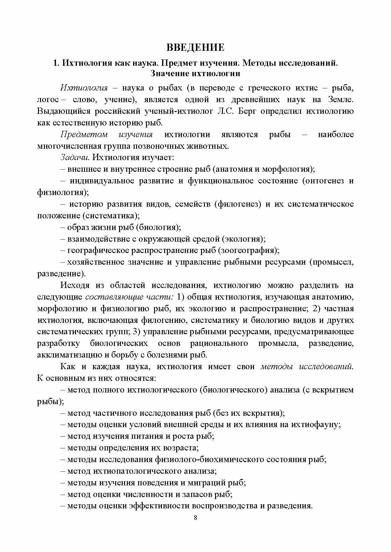 Пособие компактно представляет полный курс науки «Ихтиология». Cостоит из трех частей: общая ихтиология, частная ихтиология (систематика) и управление рыбными ресурсами. Включает разделы: анатомия и физиология, экология, филогения и распространение рыб, систематика и особенности их биологии, промысловое использование, аквакультура, болезни рыб. Основано на классических учебниках с отражением новых изменений, внесенных зарубежными и отечественными учеными в систему рыб за последние десятилетия. Особое внимание уделено объектам, обитающим в водоемах России и прилежащих государств, а также промысловым рыбам открытых морей. Предназначено для студентов высших учебных заведений, обучающихся по направлениям подготовки: «Водные биоресурсы и аквакультура», «Биология», «Экология и природопользование» и смежным направлениям.