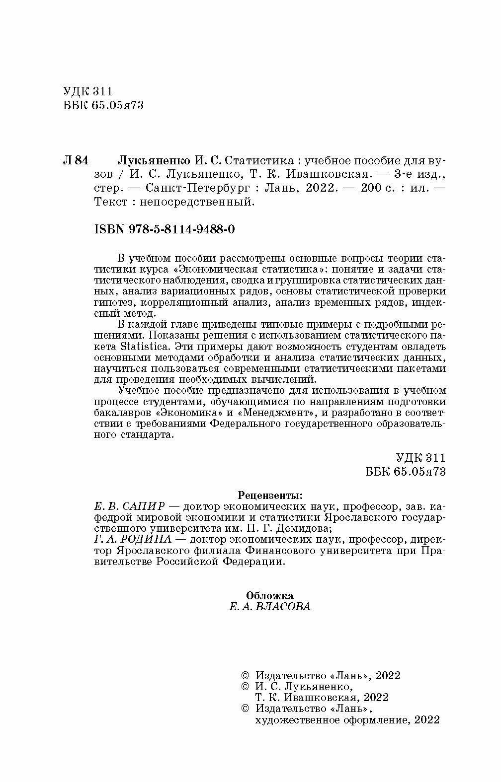 Книга: Статистика (И. С. Лукьяненко); Издательство ЛАНЬ, 2022