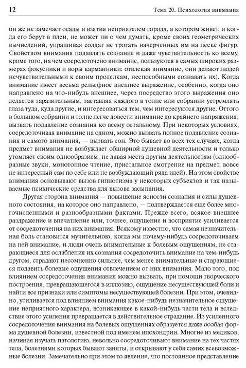 Курс общей психологии - фундаментальный для образования психологов всех специальностей, как исследователей, так и практиков. Трехтомное собрание оригинальных психологических текстов, дополняющее любой базовый учебник по темам и вопросам, определяющим структуру и содержание общей психологии, предназначено для проведения семинарских занятий по этому курсу и самообразования. Большинство текстов написано авторитетными философами, учеными и авторами учебников, имеющими мировое признание. В третьем томе представлен раздел «Субъект познания», который посвящен психологии познания человеком окружающего мира. Он состоит из четырех книг. В этой книге представлены тексты по темам: «Психология внимания» и «Психология воображения». Данное учебное пособие подготовлено сотрудниками факультета психологии МГУ имени М. В. Ломоносова для студентов и преподавателей факультетов психологии университетов, а также других высших учебных заведений, в которых изучается психология. Многие тексты этой книги вызовут интерес и у широкого круга читателей.