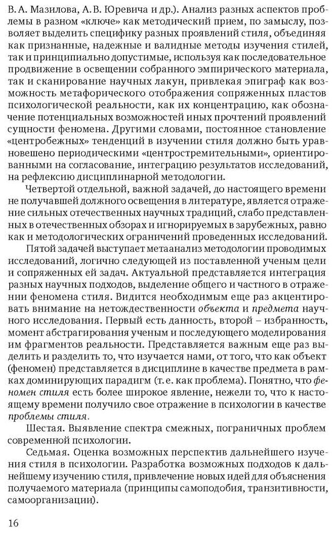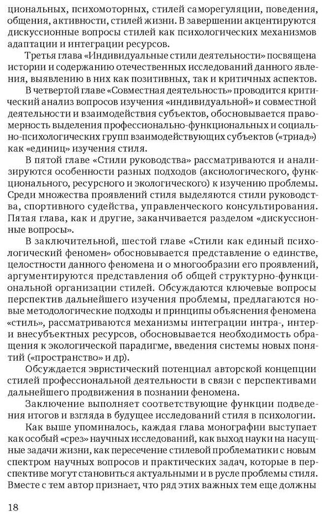 В монографии рассматриваются результаты исследований стилей как психологических систем адаптации к среде, к части среды: индивидуальных стилей деятельности, когнитивных, эмоциональных, психомоторных, саморегуляции, стилей жизни, поведения, общения, активности, стилей руководства и др. Обсуждаются дискуссионные вопросы проблемы стилей. Задачами предпринятого историко-теоретического анализа являются: поиск и разработка методологических оснований, позволяющих с единых методологических позиций, посредством единого понятийного аппарата рассмотреть разнообразие проявлений феномена стиля; разработка возможных подходов к дальнейшему изучению стиля, привлечение новых идей для объяснения получаемого материала (принципы самоподобия, транзитивности, самоорганизации); оценка возможных перспектив дальнейшего изучения стилей в психологии. Предложен подход к разработке интегральной концепции стилей в русле исследований научной школы В. С. Мерлина-Е. А. Климова, как поэтапное восхождение от частного к общему, к более полному отражению сущности стиля как бытия частных систем в общих в цепочке ИСД