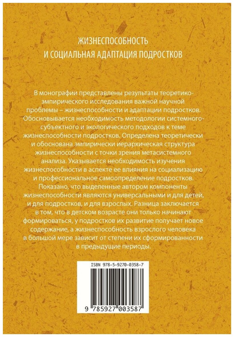 В монографии представлены результаты теоретико-эмпирического исследования важной научной проблемы - жизнеспособности и адаптации подростков. Обосновывается необходимость методологии системного-субъектного и экологического подходов к теме жизнеспособности подростков. Определена теоретически и обоснована эмпирически иерархическая структура жизнеспособности с точки зрения метасистемного анализа. Указывается необходимость изучения жизнеспособности в аспекте ее влияния на социализацию и профессиональное самоопределение подростков. Показано, что выделенные автором компоненты жизнеспособности являются универсальными и для детей, и для подростков, и для взрослых. Разница заключается в том, что в детском возрасте они только начинают формироваться, у подростков их развитие получает новое содержание, а жизнеспособность взрослого человека в большой мере зависит от степени их сформированности в предыдущие периоды.