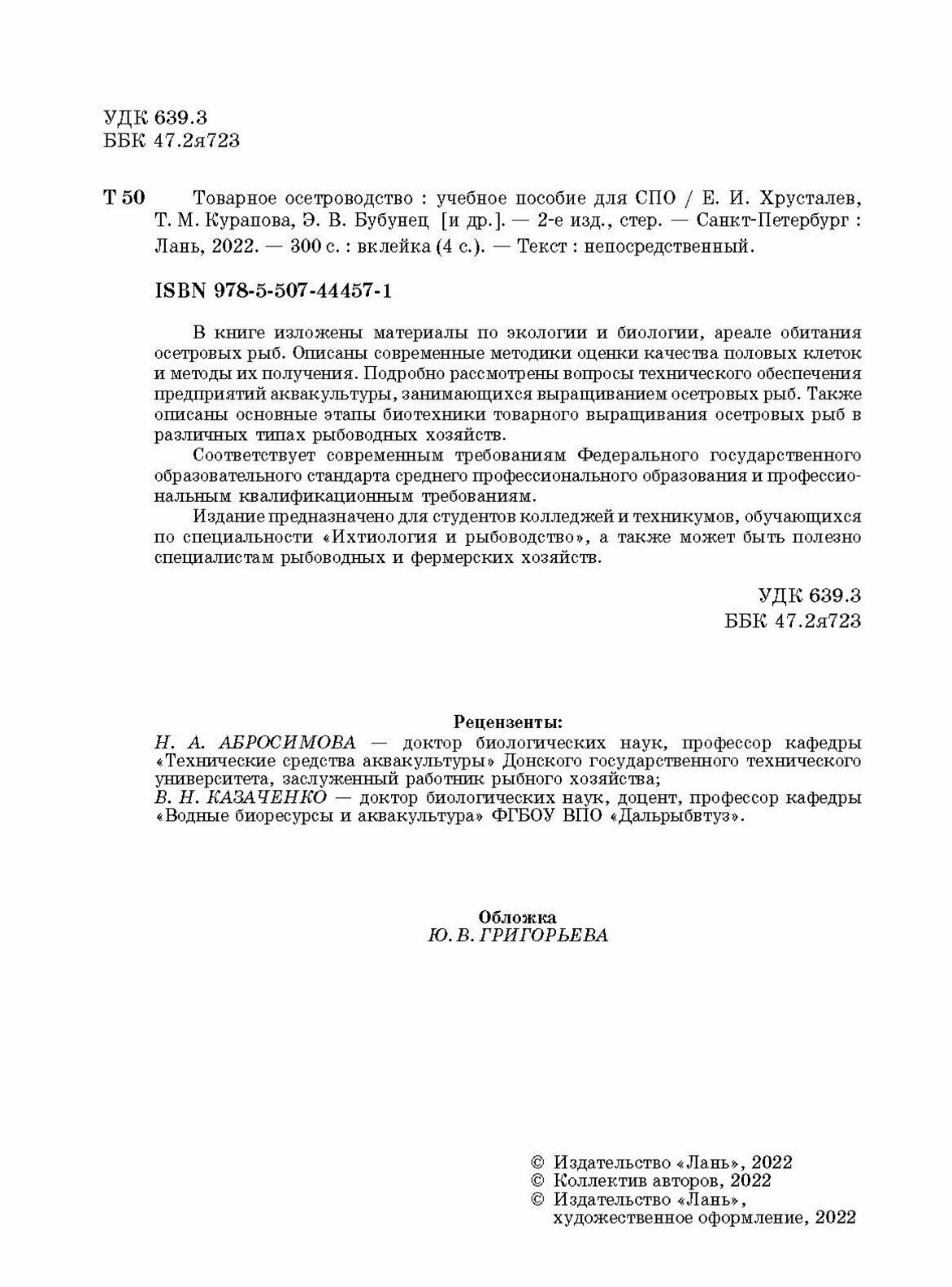 В книге изложены материалы по экологии и биологии, ареале обитания осетровых рыб. Описаны современные методики оценки качества половых клеток и методы их получения. Подробно рассмотрены вопросы технического обеспечения предприятий аквакультуры, занимающихся выращиванием осетровых рыб. Также описаны основные этапы биотехники товарного выращивания осетровых рыб в различных типах рыбоводных хозяйств. Соответствует современным требованиям Федерального государственного образовательного стандарта среднего профессионального образования и профессиональным квалификационным требованиям. Издание предназначено для студентов колледжей и техникумов, обучающихся по специальности «Ихтиология и рыбоводство», а также может быть полезно специалистам рыбоводных и фермерских хозяйств.