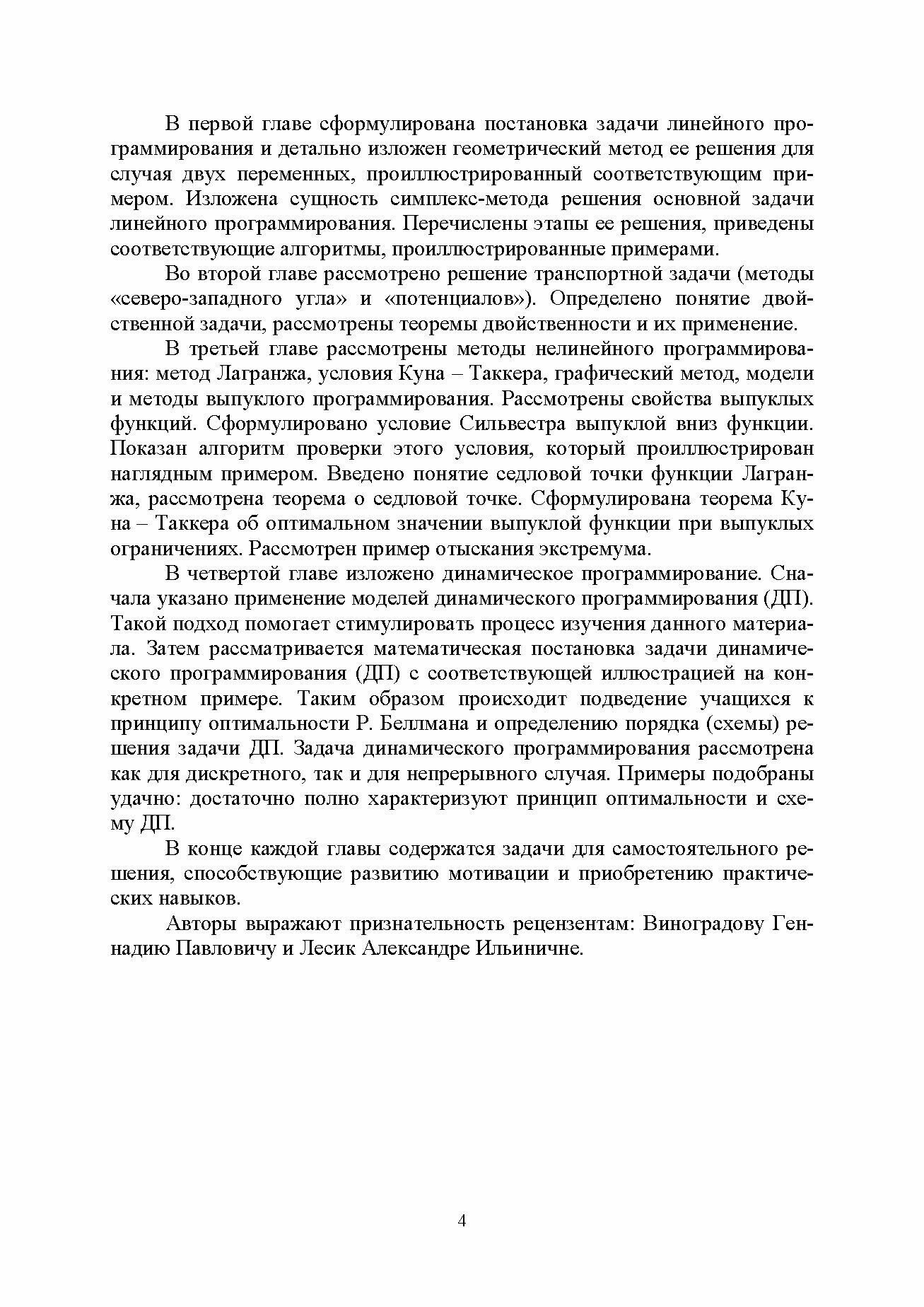 Рассмотрены методы линейного программирования (графический и симплекс методы), теория двойственности, транспортная задача (методы «северо западного угла» и «потенциалов») и ее модификации, необходимое и достаточное условия безусловного экстремума, метод неопределенных множителей Лагранжа, условия Куна - Таккера, геометрический метод решения задачи нелинейного программирования, выпуклое программирование, метод динамического программирования для дискретного и непрерывного случая. Удачно подобраны примеры из экономической области, которые легко перефразируются на техническую область. В конце каждой главы приведены задачи для самостоятельного решения. Это позволяет закрепить изученный материал и приобрести навыки практического применения и обобщения рассмотренных методов и моделей. Соответствует современным требованиям Федерального государственного образовательного стандарта среднего профессионального образования и профессиональным квалификационным требованиям. Рекомендуется для укрупненных групп специальностей среднего профессионального образования «Экономика и управление», «Информатика и вычислительная техника».