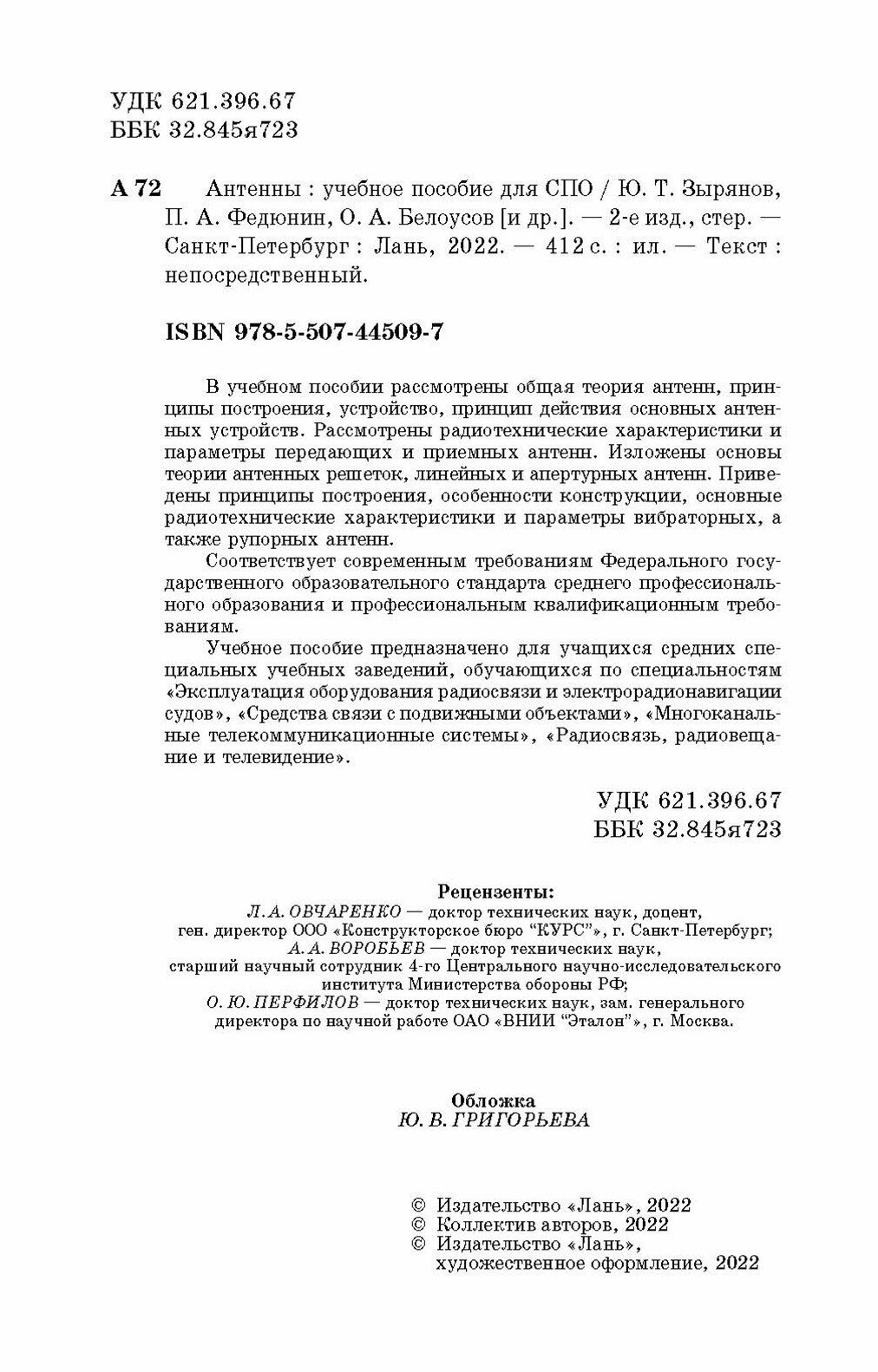 Книга: Антенны (Белоусов Олег Андреевич, Федюнин Павел Александрович, Зырянов Юрий Трифонович); Лань, 2022