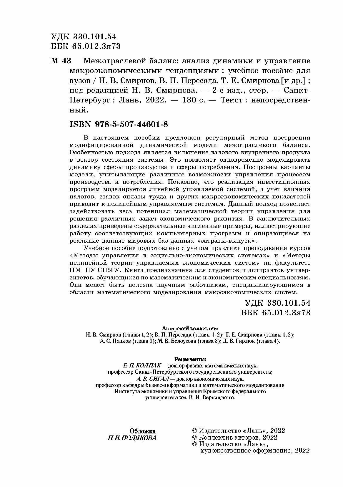 Межотраслевой баланс: анализ динамики и управление макроэкономическими тенденциями (Пересада Виктор Петрович, Смирнов Николай Васильевич, Смирнова Татьяна Евгеньевна); Лань, 2022