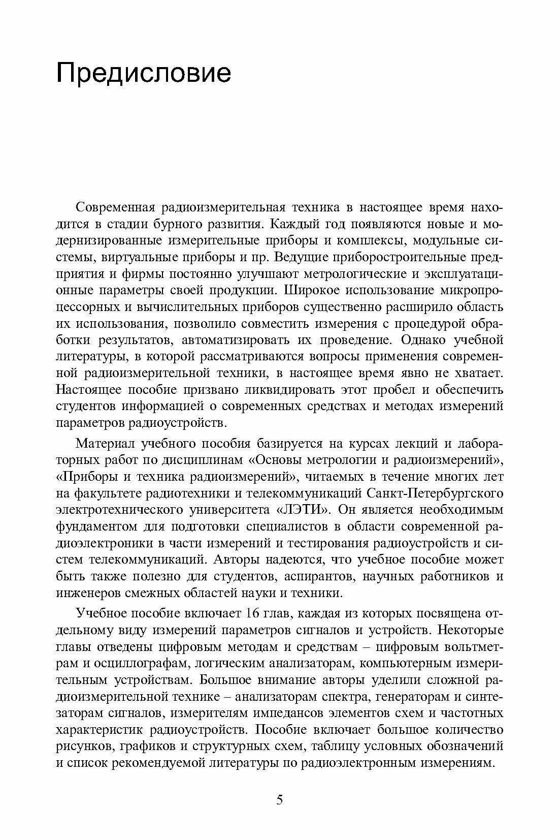 В учебном пособии изложены основные методы и виды радиоэлектронных измерений, включая методы и средства измерения напряжения, частоты и фазового сдвига, RLC-параметров компонентов и устройств. Значительная часть пособия посвящена осциллографам и осциллографическим измерениям, анализаторам спектра и измерителям параметров радиосигналов. Рассмотрены современные измерительные генераторы и логические анализаторы цифровых устройств, измерители АЧХ радиоустройств, приведены сведения по компьютерным измерительным устройствам и виртуальным приборам. Материал пособия представлен с учетом современных достижений радиоизмерительной техники, что позволяет ликвидировать пробелы в существующей учебной литературе по аналогичной тематике. Помимо теоретического материала приводятся контрольные вопросы для самостоятельной работы студентов. Учебное пособие рекомендуется для использования в учебном процессе технических вузов по программам подготовки бакалавров по направлению «Электроника, радиотехника и системы связи». Издание третье, стереотипное