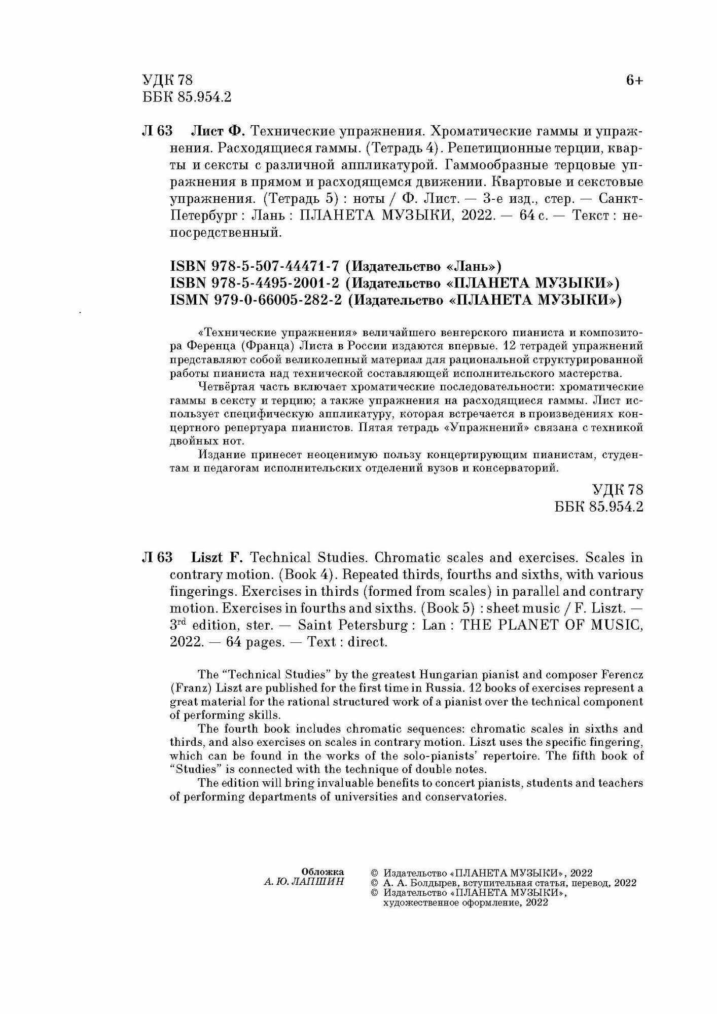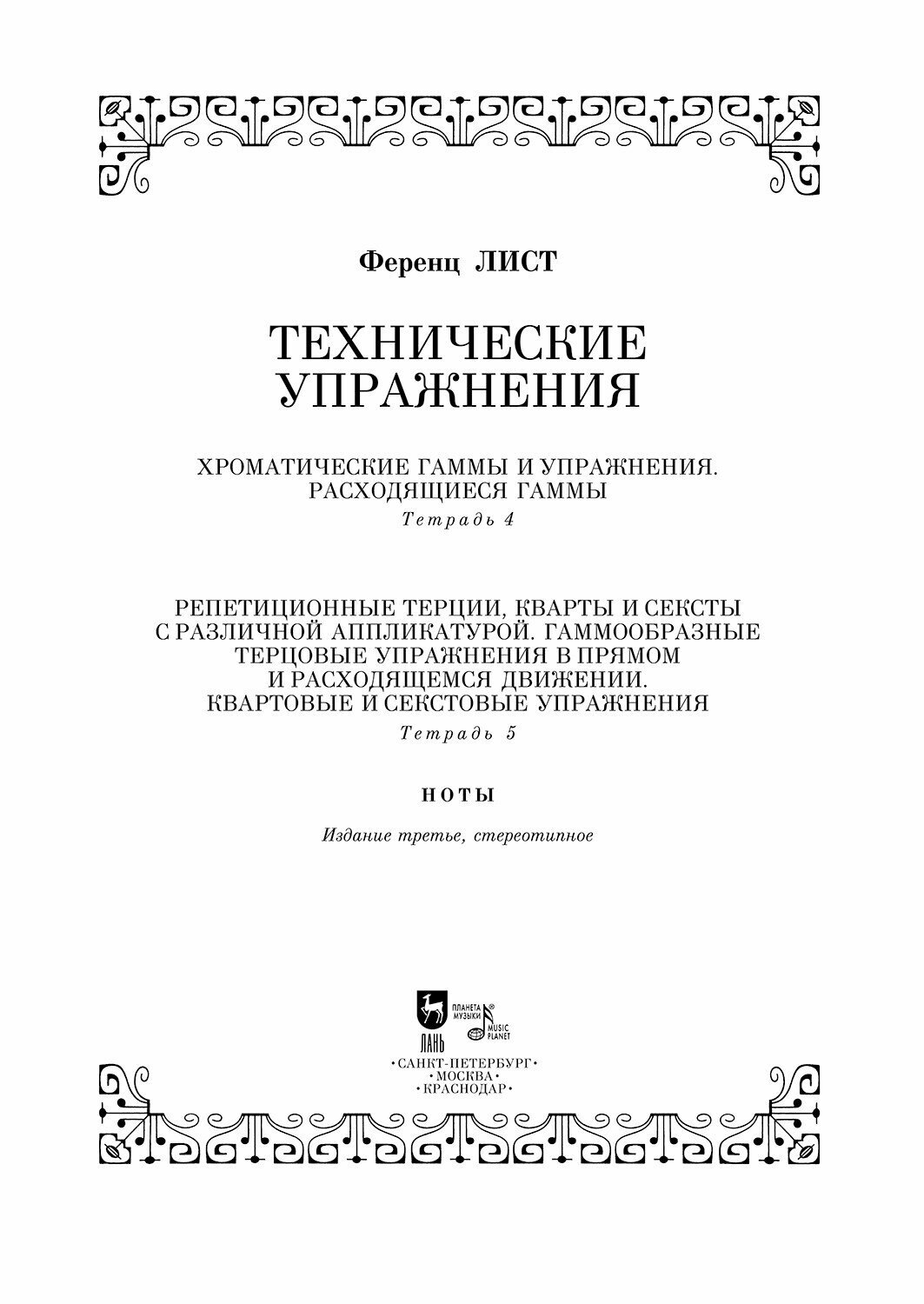 «Технические упражнения» величайшего венгерского пианиста и композитора, Ференца (Франца) Листа в России издаются впервые. 12 тетрадей упражнений представляют собой великолепный материал для рациональной структурированной работы пианиста над технической составляющей исполнительского мастерства. Четвертая часть включает хроматические последовательности: хроматические гаммы в сексту и терцию; а также упражнения на расходящиеся гаммы. Лист использует специфическую аппликатуру, которая встречается в произведениях концертного репертуара пианистов. Пятая тетрадь «Упражнений» связана с техникой двойных нот. Издание принесет неоценимую пользу концертирующим пианистам, студентам и педагогам исполнительских отделений вузов и консерваторий. The «Technical Studies» by the greatest Hungarian pianist and composer Ferencz (Franz) Liszt are published for the first time in Russia. 12 books of exercises represent a great material for the rational structured work of a pianist over the technical component of performing skills. The fourth book includes chromatic sequences: chromatic scales in sixths and thirds, and also exercises on scales in contrary motion. Liszt uses the specific fingering, which can be found in the works of the solo-pianists' repertoire. The fifth book of "Studies" is connected with the technique of double notes. The edition will bring invaluable benefits to concert pianists, students and teachers of performing departments of universities and conservatories.