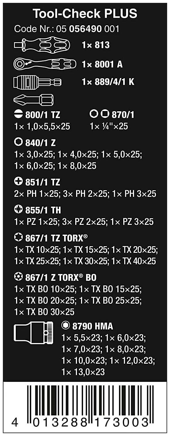 | Подробный состав комплекта | Трещотка Zyklop Mini 8001 A шестигранник 1/4" 813 ручка держатель бит с шестигранным хвостовиком 1/4" по стандарту DIN ISO 1173-C 6,3 и типом хвостовика Wera 1 Универсальный держатель 889/4/1 K Rapidaptor Стержень инструмента (соединительная деталь) 870/1 7 торцевых головок:8790 HMA 5,5x23, 6x23, 7x23, 8x23, 10x23, 12x23, 13x23 28 бит: 6 бит851/1 TZ Phillips 1x25- 2 шт., PH 2x25- 3 шт., PH 3x25 5 бит 855/1 THPozidriv PZ 1x25, PZ 2x25- 3 шт., PZ 3x25 6 бит 867/1 TZ TORX® TX 10x25, TX 15x25, TX 20x25, TX 25x25, TX 30x25, TX 40x25 5 бит 867/1 Z TORX® BO TX 10x25, TX 15x25, TX 20x25, TX 25x25, TX 30x25 5 бит 840/1 Z Hex-Plus 3x25, 4x25, 5x25, 6x25, 8x25 бита 800/1 TZ 1x5,5x25 |