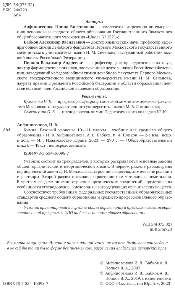 Химия. Базовый уровень: 10-11 классы 2-е изд. испр. и доп. Учебник для СОО (Александр Васильевич Бабков); ЮРАЙТ, 2023