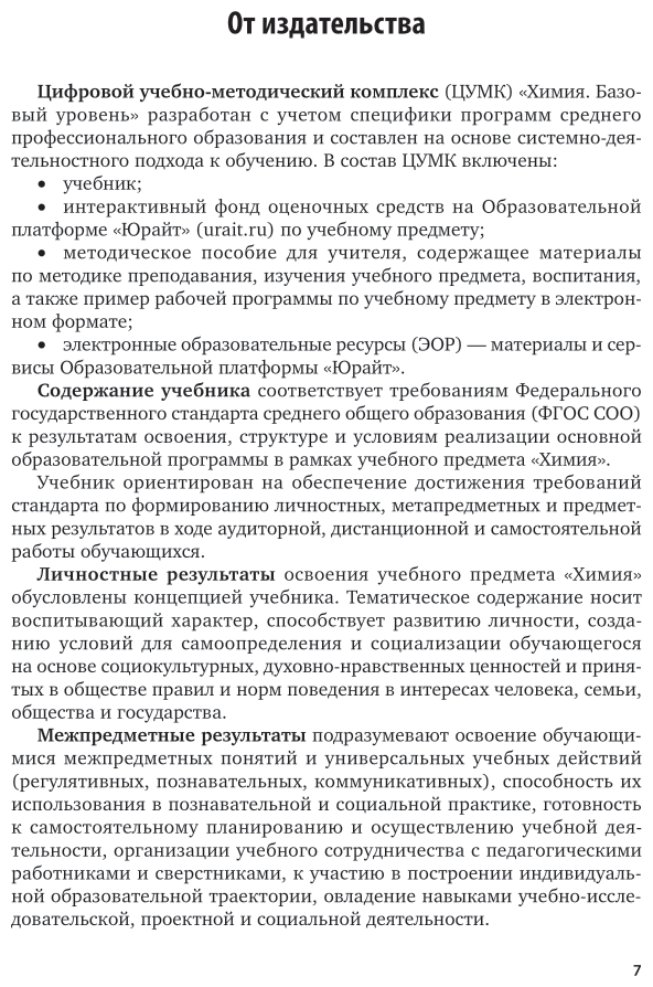 Учебник состоит из трех разделов, в которых раскрываются основные законы общей, органической и неорганической химии. В первом разделе рассмотрены периодический закон Д. И. Менделеева, строение вещества, химические реакции и растворы. Второй раздел посвящен характеристике металлов и неметаллов. В третьем разделе описано строение органических соединений, представлены особенности углеводородов, кислород- и азотсодержащих органических веществ. Соответствует требованиям федеральных государственных образовательных стандартов среднего общего образования и среднего профессионального образования. Учебник ориентирован на среднее общее образование в пределах освоения образовательной программы СПО на базе основного общего образования.