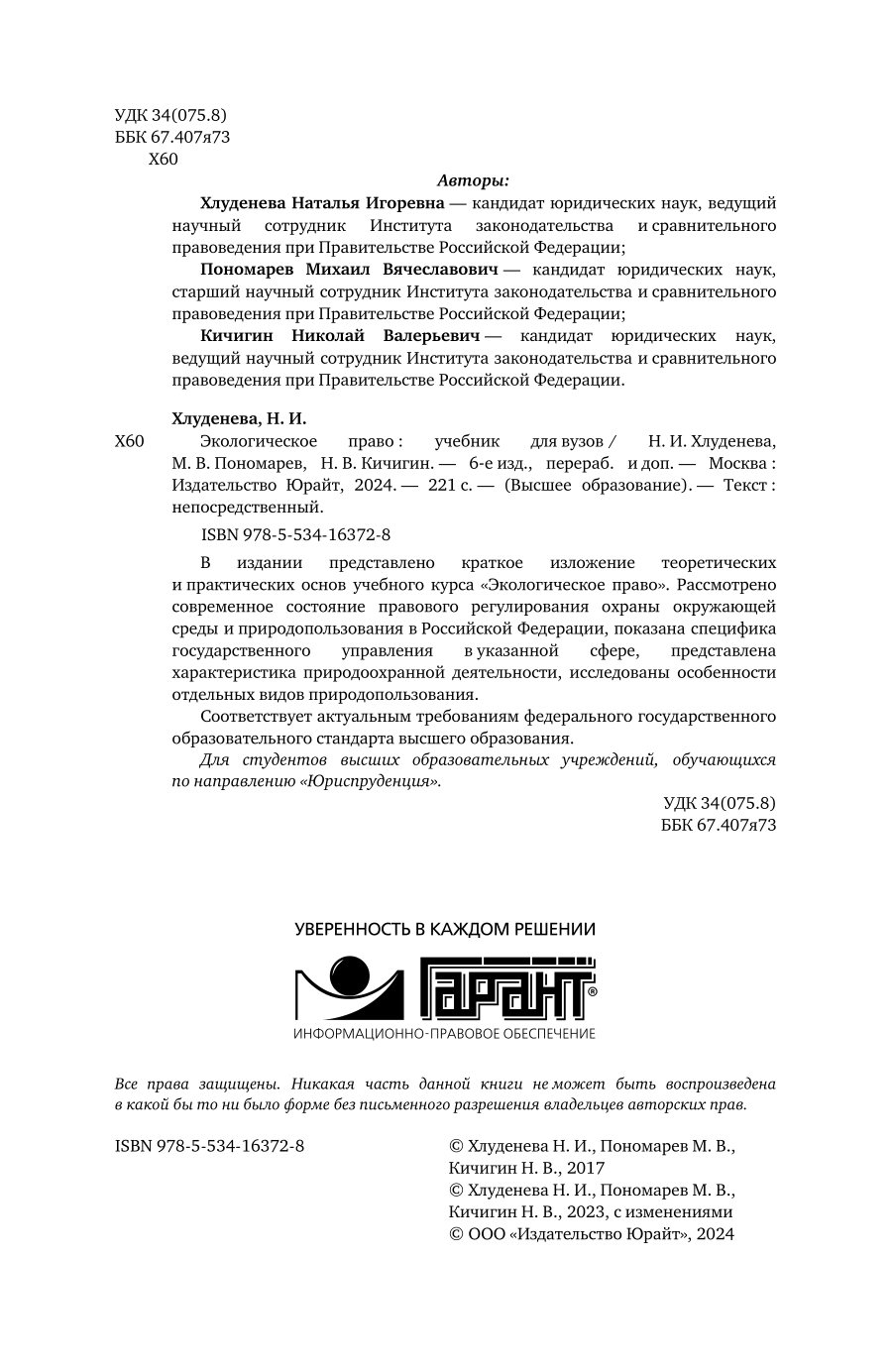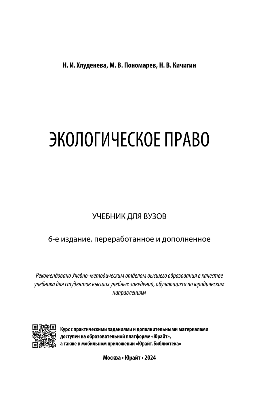 Экологическое право 6-е изд. пер. и доп. Учебник для вузов (Хлуденева Наталья Игоревна, Пономарев Михаил Вячеславович, Кичигин Николай Валерьевич), 2024