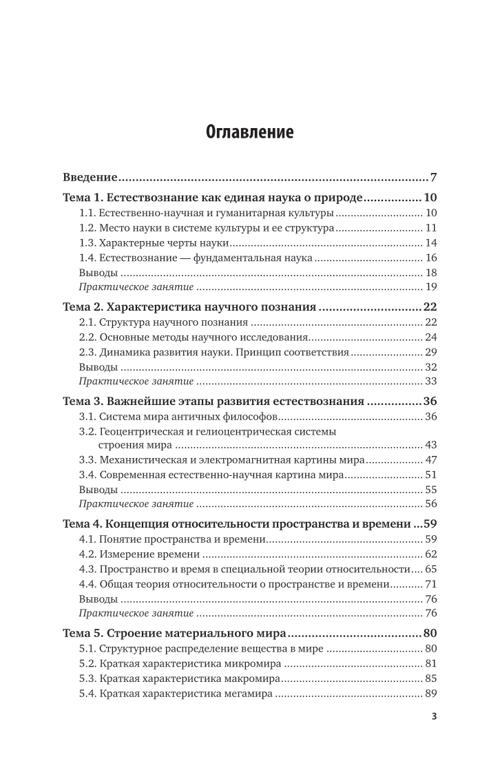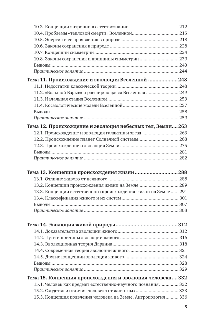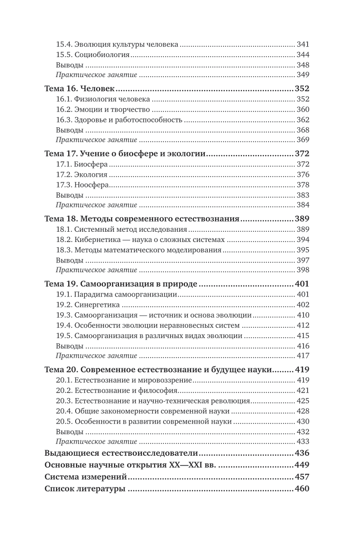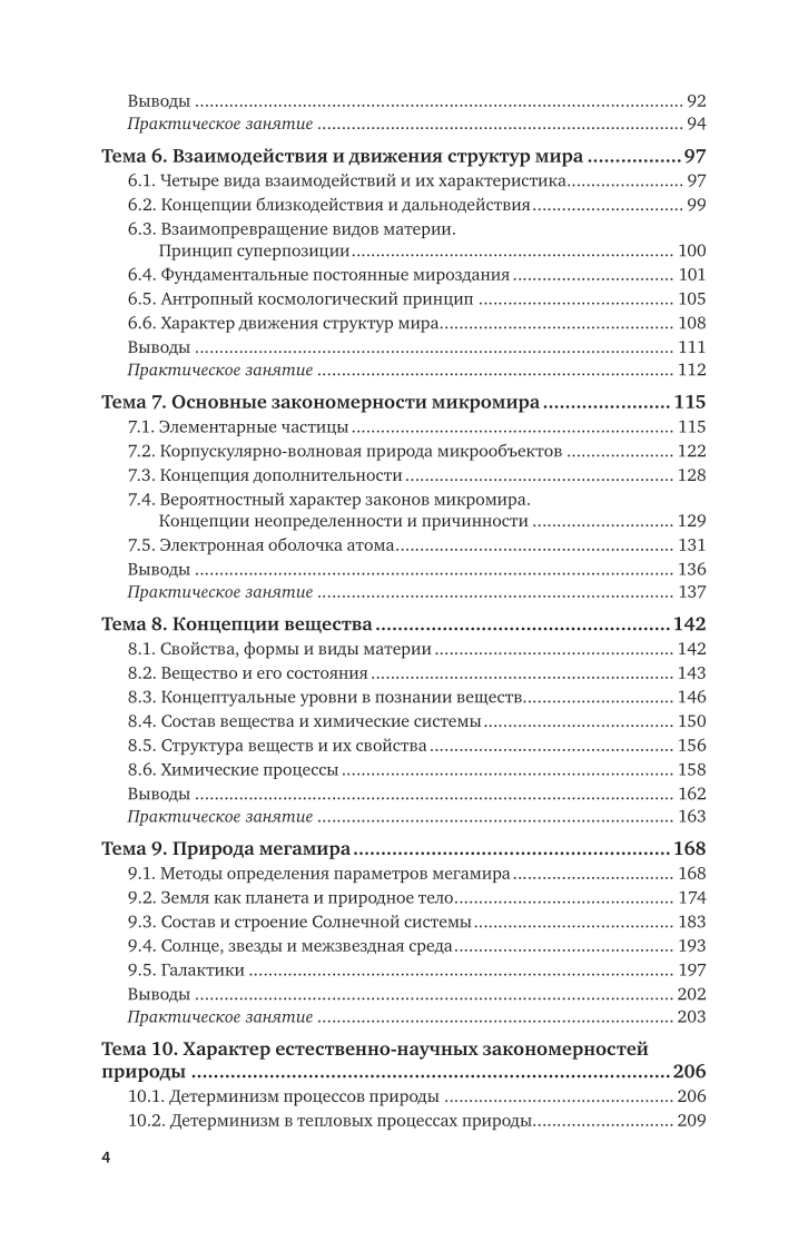В курсе рассматриваются важнейшие концепции современного естествознания: этапы развития естественнонаучной картины мира, современные представления о строении и развитии природы микро-, макро- и мегамиров; эволюция представлений о пространстве, времени и материи; принципы относительности и дополнительности; соотношение неопределенностей; законы сохранения в микро-, макро- и мегамире; природа элементарных частиц, энергии и вещества; концепции происхождения эволюции неживой, живой природы и человека; биосфера и экология; специфика современного естествознания; синергетика; самоорганизация в различных системах, проблемы современного естествознания; мировоззрение и НТР.