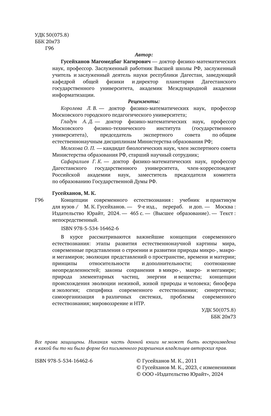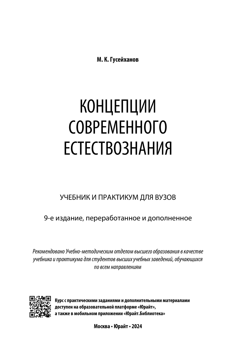 Концепции современного естествознания 9-е изд. пер. и доп. Учебник и практикум для вузов (Магомедбаг Кагирович Гусейханов); ЮРАЙТ, 2023