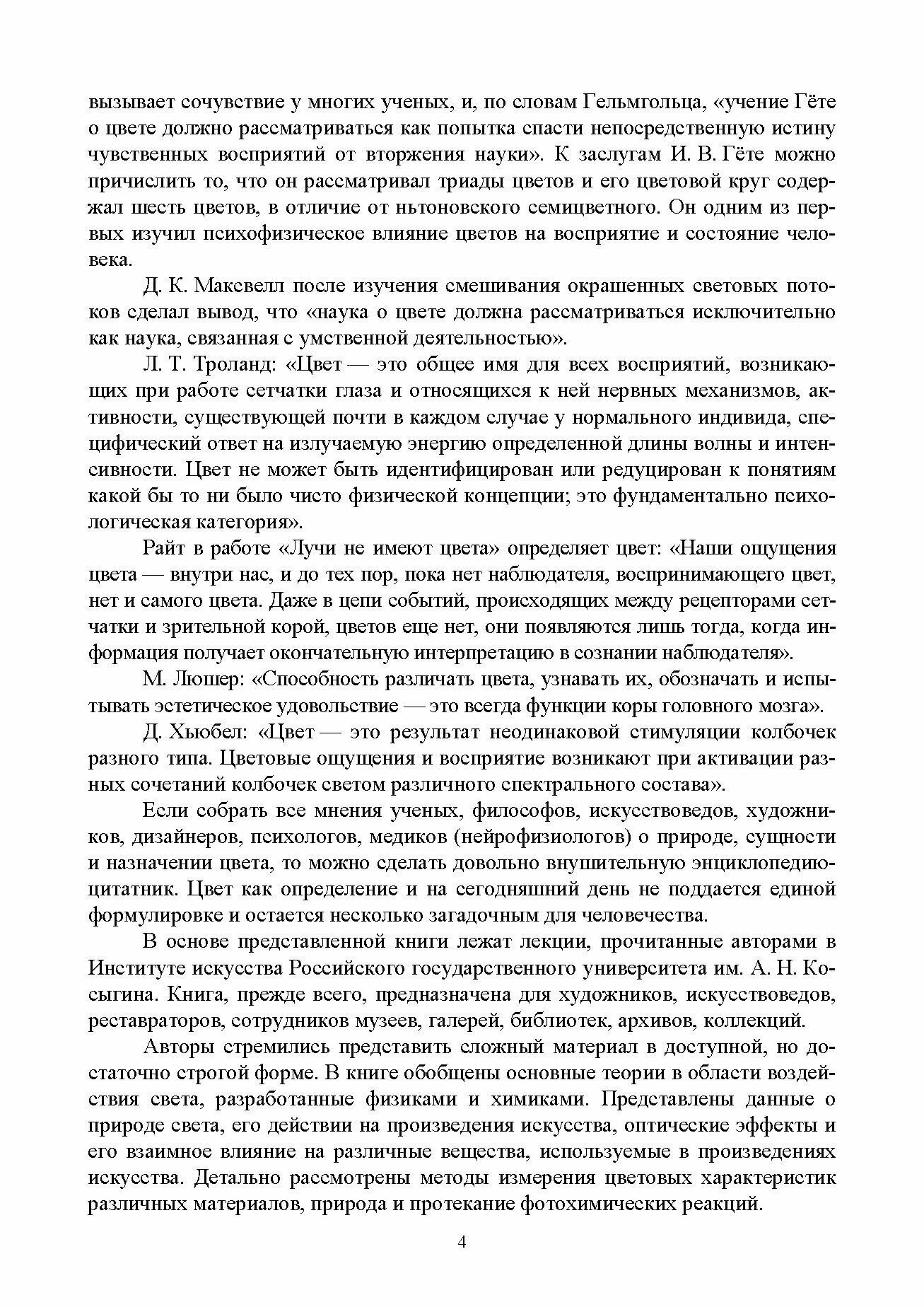 В данном учебном пособии дан анализ современного состояния науки в области теории света, описан механизм фотопроцессов, происходящих в структуре различных материалов при их естественном старении. Представлены механизмы других оптических явлений, таких как процессы цветообразования или цветовосприятия окружающего мира как органами зрения, так и приборами. Учебное пособие знакомит читателя - студента_художника, будущего реставратора или эксперта в области искусства - с различными цветовыми моделями, описывающими цвет в координатных пространствах, и с методиками поиска совместимых красителей для цветоподгонки с целью получения нужного цвета. Текст книги представлен на достаточно высоком научном уровне, но изложен языком, понятным для учащихся гуманитарных направлений подготовки. Учебное пособие предназначено для бакалавров и магистрантов, обучающихся по таким направлениям подготовки, как «Товароведение», «Теория и история искусств», «Декоративно-прикладное искусство и народные промыслы», «Реставрация», а также по всем другим специальностям в области искусствознания, и может быть использовано при изучении дисциплин «Стабилизация окрашенных материалов», «Цвет и его образование на поверхностях», «Лакокрасочные материалы», «Цвет в искусстве», «Тонирование в реставрации».