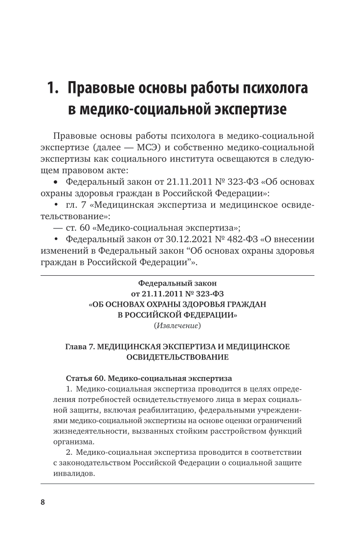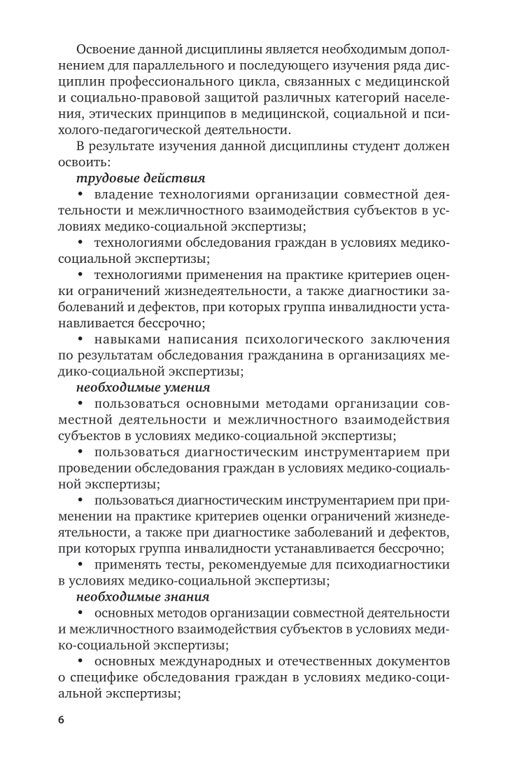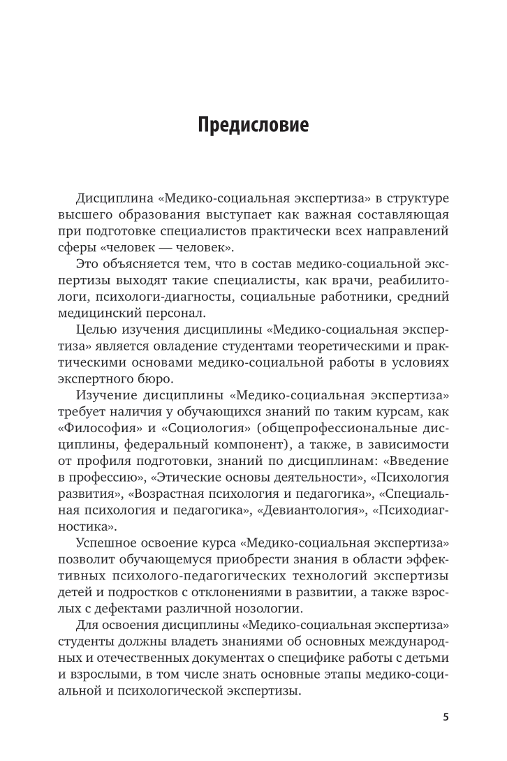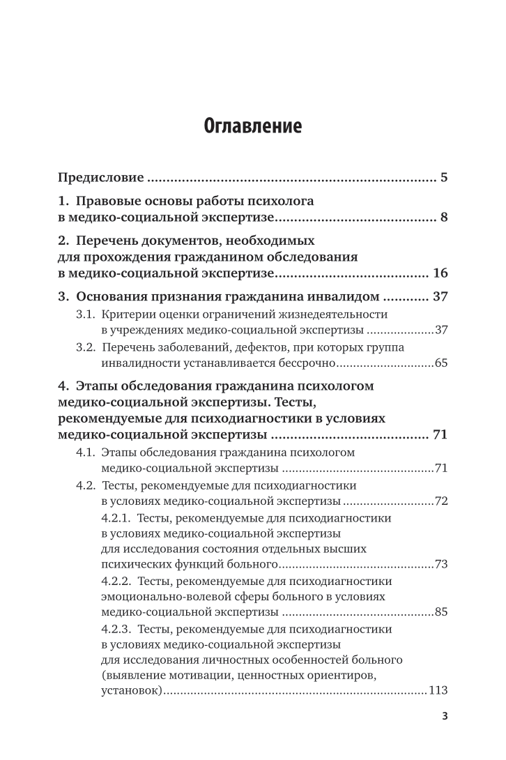 Данный курс представляет собой уникальное собрание информации по организации работы психолога в медико-социальной экспертизе. Его уникальность обусловлена прежде всего последовательным и полным собранием разнообразных источников и информации, касающейся специфики работы психолога медико-социальной экспертизы: правовые акты, методические рекомендации, перечень документов, необходимых для прохождения обследования в медикосоциальной экспертизе, основания признания гражданина инвалидом, критерии оценки ограничений жизнедеятельности в учреждениях медико-социальной экспертизы, перечень заболеваний и дефектов, при которых группа инвалидности устанавливается бессрочно, этапы обследования гражданина психологом медико-социальной экспертизы, тесты, рекомендуемые для психодиагностики в условиях медикосоциальной экспертизы, особенности написания психологического заключения, а также теоретико-методологические основы работы психолога медико-социальной экспертизы. Данный курс создан на основе опыта работы автора психологом-диагностом в Медико-социальной экспертизе города Томска (межрайонное бюро, кардиологическое бюро). Соответствует актуальным требованиям федерального государственного образовательного стандарта среднего профессионального образования и профессиональным требованиям. Для студентов образовательных учреждений среднего профессионального образования, а также всех, кого по тем или иным причинам интересует информация, касающаяся медико-социальной экспертизы.