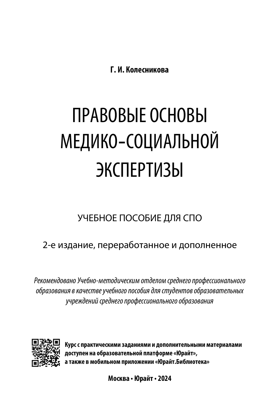 Правовые основы медико-социальной экспертизы 2-е изд. пер. и доп. Учебное пособие для СПО (Галина Ивановна Колесникова); ЮРАЙТ, 2023