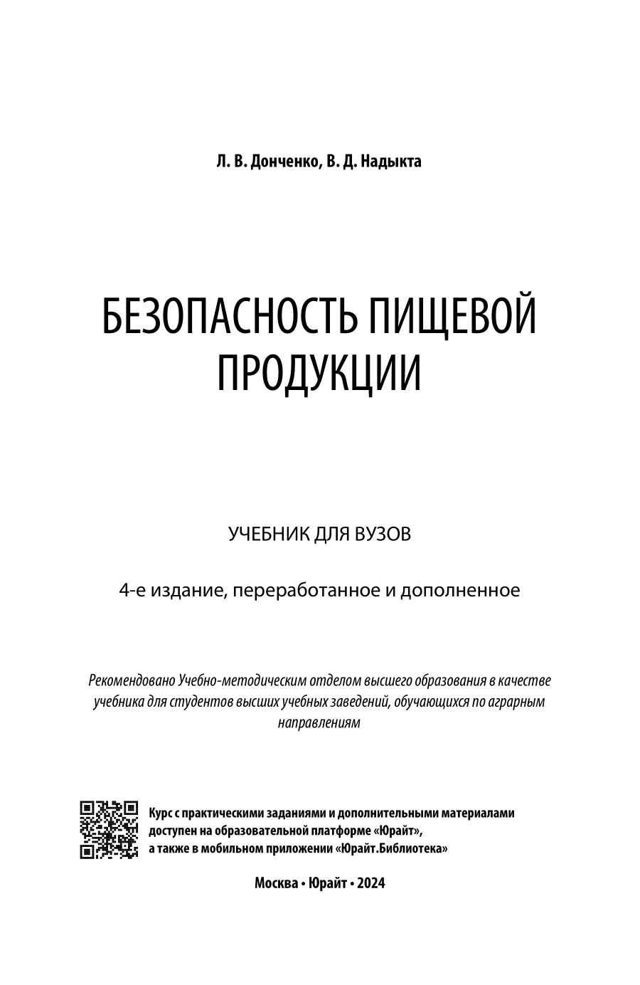 Безопасность пищевой продукции 4-е изд. пер. и доп. Учебник для вузов (Людмила Владимировна Донченко); ЮРАЙТ, 2023