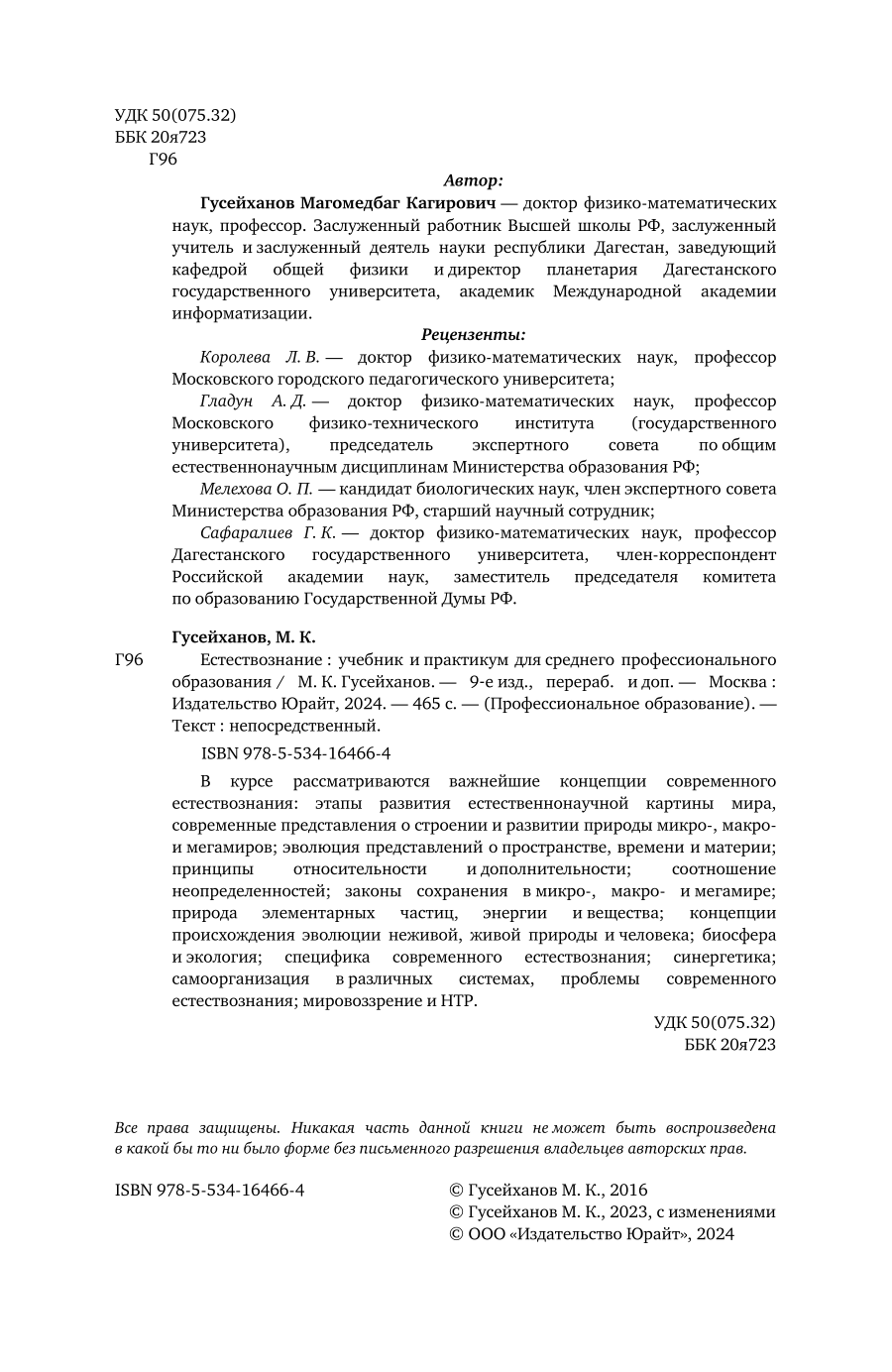 Естествознание 9-е изд. пер. и доп. Учебник и практикум для СПО (Магомедбаг Кагирович Гусейханов); ЮРАЙТ, 2023