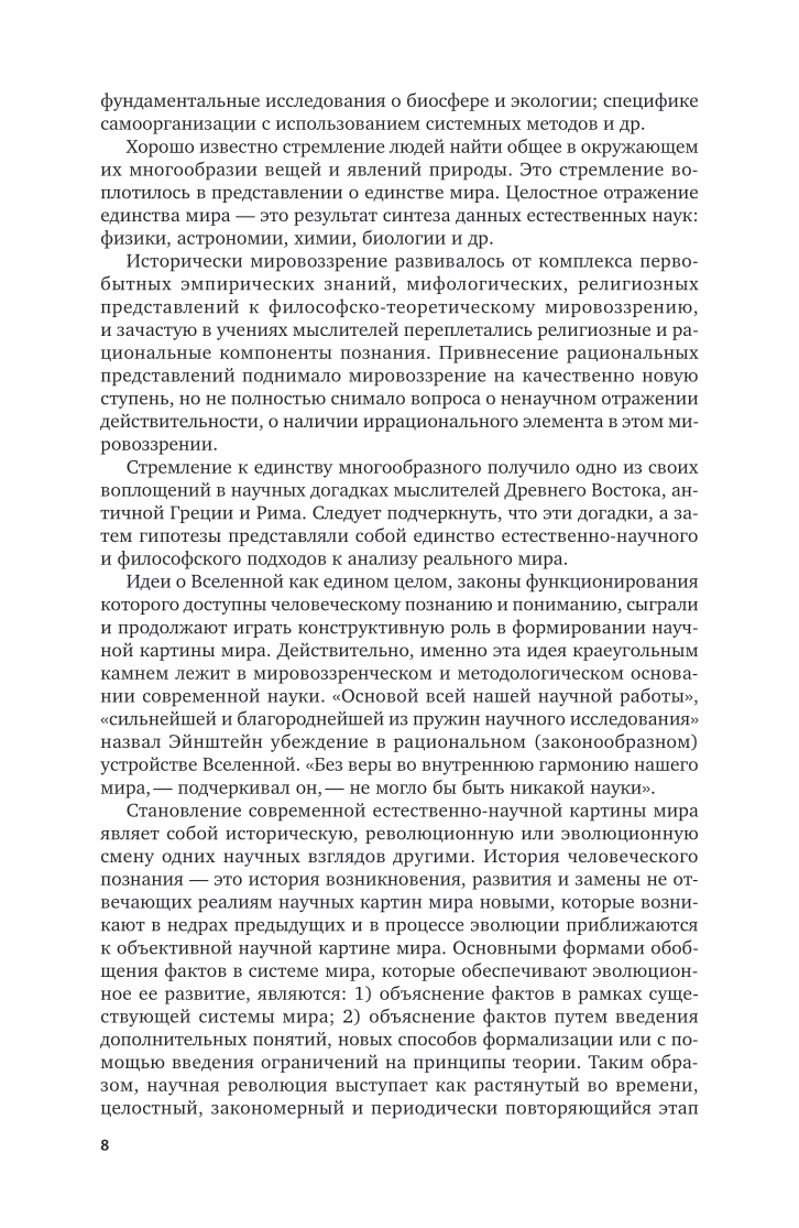 В курсе рассматриваются важнейшие концепции современного естествознания: этапы развития естественнонаучной картины мира, современные представления о строении и развитии природы микро-, макро- и мегамиров; эволюция представлений о пространстве, времени и материи; принципы относительности и дополнительности; соотношение неопределенностей; законы сохранения в микро-, макро- и мегамире; природа элементарных частиц, энергии и вещества; концепции происхождения эволюции неживой, живой природы и человека; биосфера и экология; специфика современного естествознания; синергетика; самоорганизация в различных системах, проблемы современного естествознания; мировоззрение и НТР.