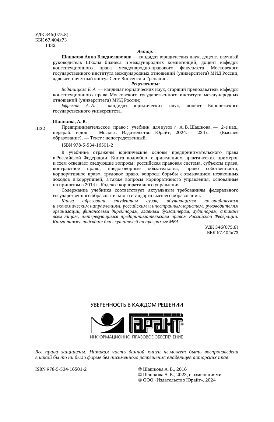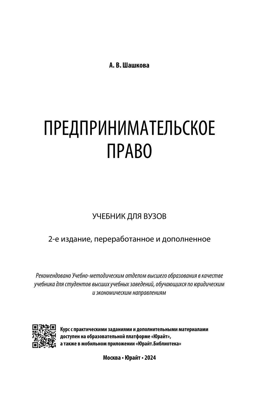 Предпринимательское право 2-е изд. пер. и доп. Учебник для вузов (Анна Владиславовна Шашкова); ЮРАЙТ, 2023