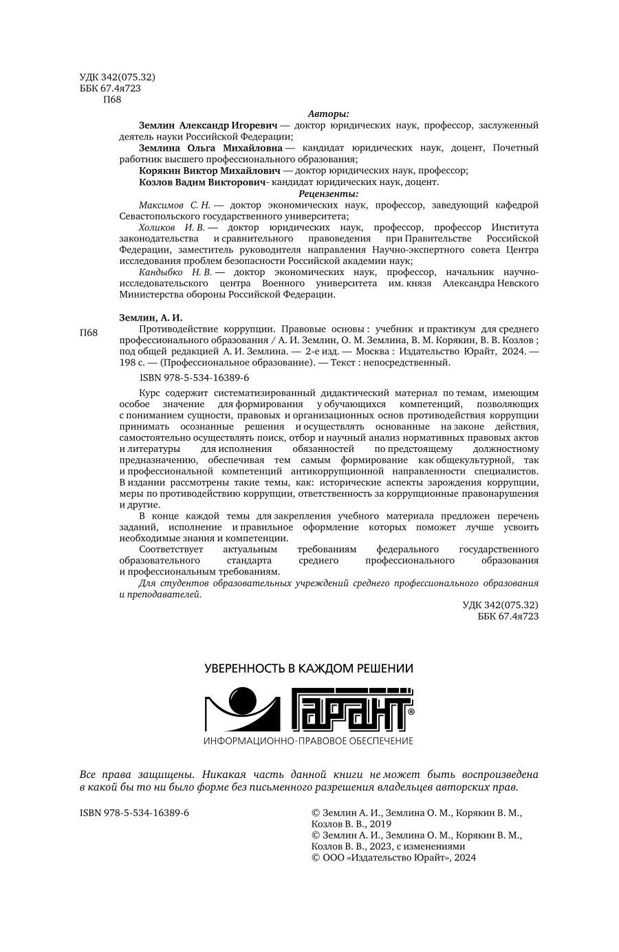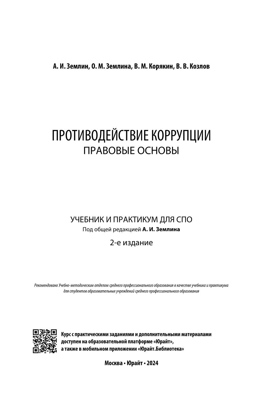 Противодействие коррупции. Правовые основы 2-е изд. Учебник и практикум для СПО (Ольга Михайловна Землина); ЮРАЙТ, 2023