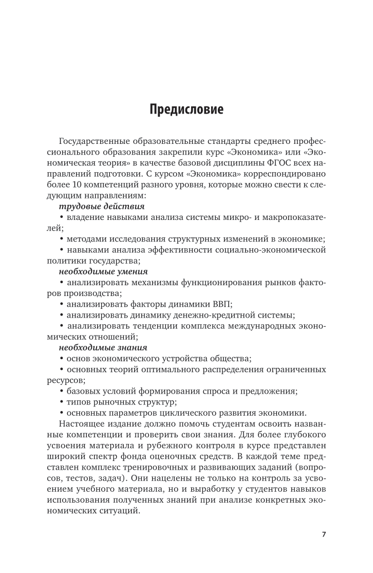 В курсе представлены взаимосвязи, возникающие в экономической системе ограниченных ресурсов и их распределения, исследованы базовые экономические категории, основы анализа спроса и предложения, типы рыночных структур, соотношение свободной конкуренции и монополии, особенности отдельных рынков. Рассмотрены основные макроэкономические модели и взаимодействия агрегированных структур рыночной экономики в их равновесном и динамическом контексте. Курс наряду с традиционными разделами раскрывает ряд вопросов финансовой, социальной политики и внешнеэкономических связей. Содержание целого ряда разделов основано на современных статистических показателях России, учитывающих международную систему национальных счетов. Соответствует актуальным требованиям Федерального государственного образовательного стандарта среднего профессионального образования и профессиональным требованиям. Для преподавателей и студентов образовательных учреждений среднего профессионального образования.